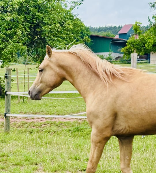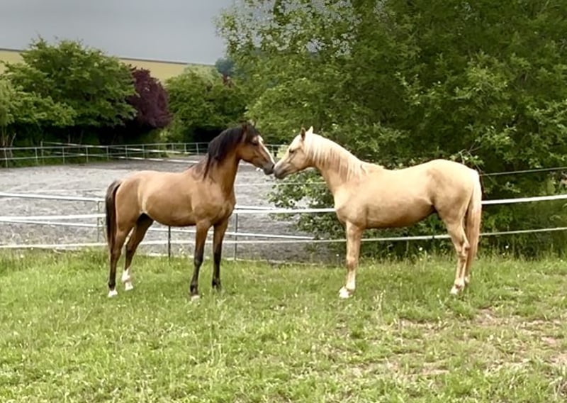 Caro's Sir Toffee was intentionally bred from our Holsteiner mare by Big Star x Lux Z in combination with the proven Welsh B stallion Cadlanvalley Sir Ivenhoe, as the mare was unable to carry a warmblood foal as her first offspring due to an injury. Top Holsteiner show jumping genetics from the former world champion of show jumping horses, Big Star, are combined here with the cleverness and beautiful color of Sir Ivenhoe! Not only is he an exciting option for pony breeders for this year's pony licensing, but if gelded, he could also be an absolute future show jumping pony offer in the special color Palomino! Currently, Sir Toffee is about 1.43 m tall and will very likely remain within the pony height. This is why we have to part with him with a heavy heart, as we expected him to grow to around 1.55-1.60 m, which is not the case. Sir Toffee is very correct in conformation, is halter-trained, vaccinated, regularly seen by the farrier, and has been raised with us since foaling in a small group in a year-round open stable. He has decent basic gaits, with the canter being particularly noteworthy. Character-wise, he is a very sweet guy and will certainly become an excellent sport/kids and family pony. His sire, Cadlanvalley Sir Ivenhoe, has proven to be a significant sire for sport ponies in all disciplines with excellent temperament over the past few years - especially in combination with warmblood mares! We will only sell him to a 100% suitable and sport- and/or breeding-promoting home. Come by and see him live! Please, no countless inquiries about the last price and numerous videos. He is growing up in a species-appropriate manner and therefore has not yet been worked or free-jumped!
