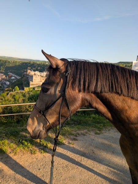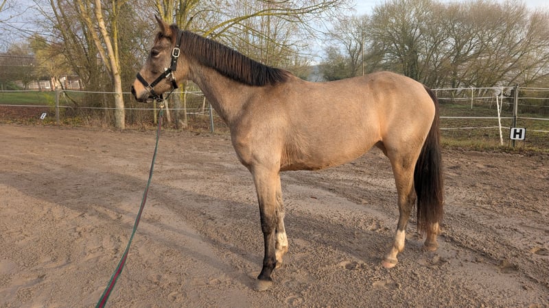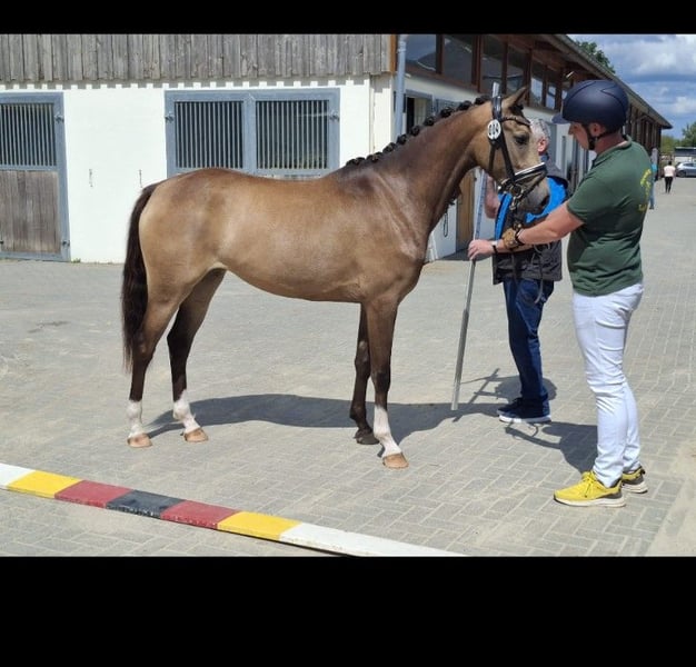 Cassia de Confluentia – buckskinfarbene Nachwuchsstute mit Top-Charakter Kleines Deutsches Reitpferd / XXL-Pony Zum Verkauf steht die außergewöhnlich brave und bildschöne Stute Cassia de Confluentia in der seltenen Farbe Buckskin. Cassia überzeugt nicht nur durch ihr elegantes Erscheinungsbild, sondern vor allem durch ihren einwandfreien Charakter und ihre vielseitige Veranlagung – ein echtes Familienpferd und ein Rohdiamant mit Perspektive. Cassia wurde als Absetzer erworben und stammt aus einer bedachten, pferdegerechten Aufzucht. Sie wurde stets altersgerecht beschäftigt, regelmäßig entwurmt und dem Schmied vorgestellt. Die Stute kennt Bodenarbeit, ist longiert und wurde bereits ca. 10-mal angeritten. Anschließend erhielt sie bewusst eine Pause aufgrund eines Wachstumsschubs. Sie ist ein Pferd, das Zeit bekommen hat zu reifen – ohne Überforderung, aber mit solider Grundausbildung. Im täglichen Umgang zeigt sich Cassia außerordentlich artig, ruhig und menschenbezogen. Sie ist kinderlieb, kennt den Familienalltag und hat keinerlei Unarten. Brav bei der Hufbearbeitung, unkompliziert beim Verladen und insgesamt sehr angenehm im Handling – auch für weniger erfahrene Pferdemenschen geeignet. Züchterisch ist Cassia ebenfalls hochinteressant: Sie wurde dreijährig mit Verbandsprämie ins Stutbuch eingetragen und hat 2026 die Möglichkeit zur Staatsprämienanwartschaft bei der Elitestutenschau in Zweibrücken. Abstammung: Vater ist der Elitehengst Cadlanvalley Sir Ivanhoe, bekannt für seine typvolle, rittige und vielseitige Nachzucht. Aus der bewährten Anpaarung mit ihrer Mutter gingen bereits mehrere hochprämierte Fohlen sowie Schausieger hervor. Cassia vereint Charakter, Qualität und Perspektive – sei es als zukünftiges Kinder- und Familienpferd, Freizeitpartner mit Ambitionen oder als interessante Nachwuchsstute für Zucht und Schau. Ein Pferd mit viel Herz, Verstand und Talent – ein wahrer Rohdiamant, der nun seinen Menschen sucht, der ihn weiter fördert.