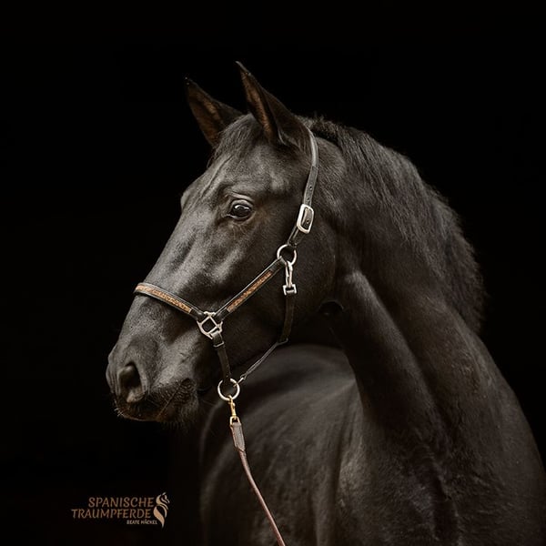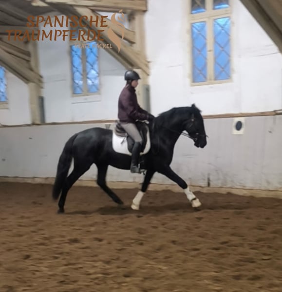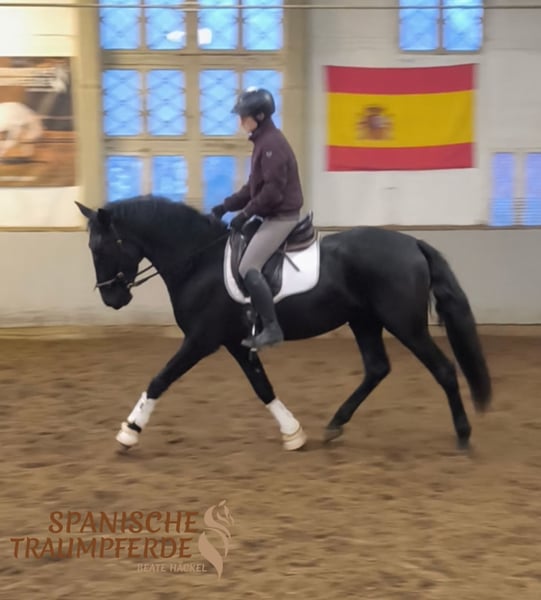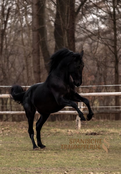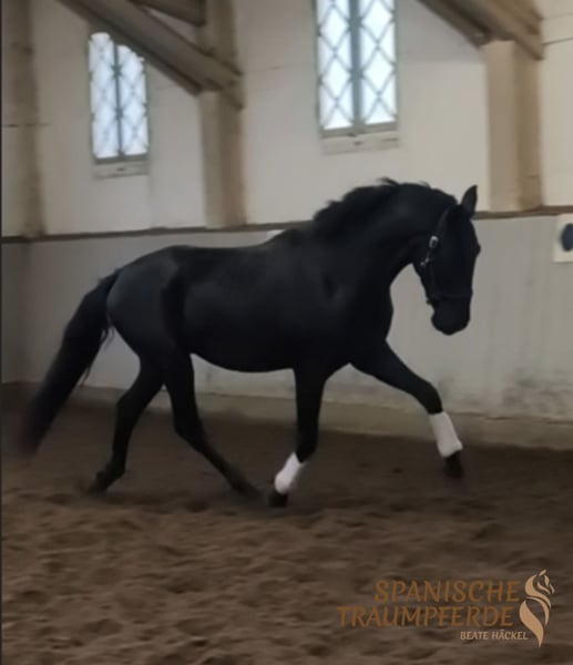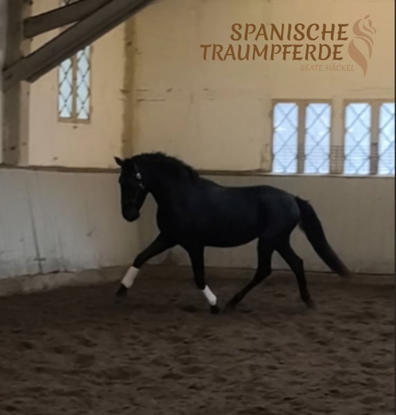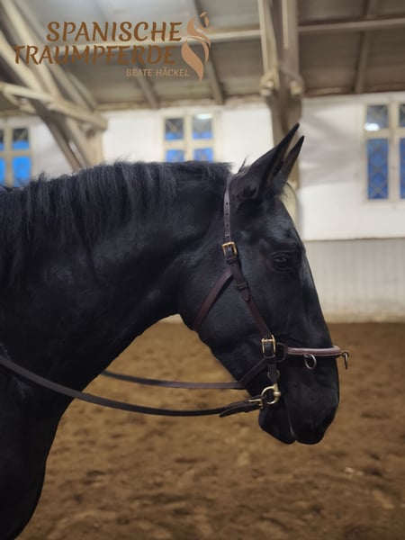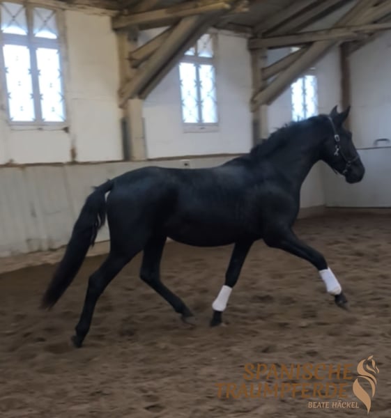 Have you always dreamed of owning a jet-black horse? Now you can turn that dream into reality with our beautiful 3.5-year-old black stallion ✨SIRIUS SH✨. This stunning PRE gelding shines in the sun with his black coat, looking as if it has been polished. But he is not only striking because of his eye-catching color; his gentle and very polite character makes him truly special. His baroque exterior combined with a wonderful, ground-covering movement makes him a comfortable riding horse. Currently, due to his young age, our handsome black colt is primarily being introduced to his future life as a riding horse through groundwork. He has become familiar with saddle and rider weight. Under saddle, SIRIUS moves nicely in the basic gaits and already provides his rider with a confident and secure feeling, even at the beginning of his training. SIRIUS SH is not a daredevil; he is very sensitive, somewhat cautious, and requires a gentle approach to win his heart. But once you have won this enchanting horse over, he will open his big heart, and you will gain a lifelong friend. Videos can be found on my website: www.spanische-traumpferde.de A personal visit to meet this wonderful horse is gladly arranged. Prior appointment is recommended. We allocate sufficient time for this visit, and to protect our horses, we charge a flat fee of €50. X-ray images are available. Location: 23795 Traventhal