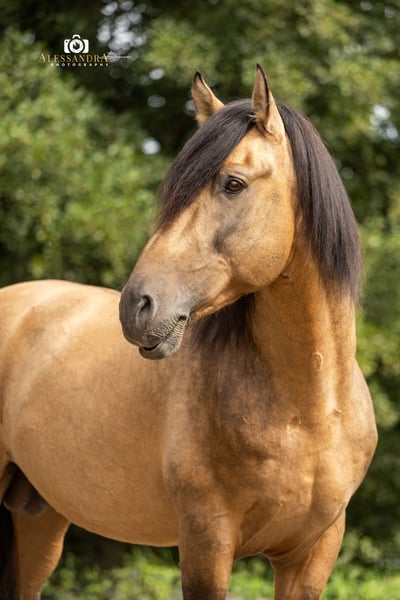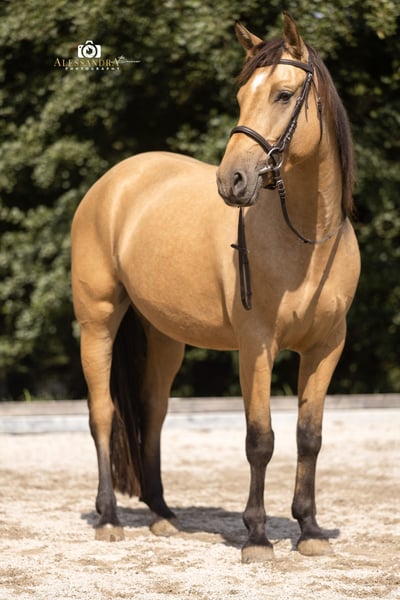 In opdracht van de fokker: Martini van Steinreb… …hier biedt zich de unieke kans om een uitzonderlijke allrounder in een bijzondere kleur te kopen, die door haar harmonieuze gangen en haar springende bewegingen zeker indruk maakt. Deze charmante Falbastute komt uit Duitse fokkerij, is ingeschreven bij de Bayerische Verband voor Spezialrassen als „Spaans Sportpaard“ en is als veulen gepremieerd. Hierdoor heeft ze volle papieren, wat haar waardevol maakt voor de fokkerij. Het contact met mensen vanaf dag één en de hoogwaardige opfok hebben zich duidelijk uitbetaald en blijven een leven lang voordeel bieden. Martini is uitgegroeid tot een evenwichtige persoonlijkheid die altijd weloverwogen handelt, maar toch weet wat ze wil. Wie haar in zijn stal heeft, gaat erdoorheen voor haar. Tijdens haar gehele opleiding is veel aandacht besteed aan een training die haar mentale en fysieke niveau ondersteunt. Conform haar leeftijd is ze correct gereden in de basisgangen, getraind in horsemanship en aan de hand gewerkt en gymnasticeerd. Uiteraard is Martini ook vertrouwd met de eigen terreinroute op het erf en groepsritten in het terrein. Ze heeft al aan verschillende cursussen op de manege deelgenomen en kent de typische bedrijvigheid op de manege, zoals kinderen, honden, andere paarden die komen en gaan, rijden in de bak met andere paarden – alles neemt ze kalm en ontspannen. Martini stamt af van een Pura Raza Española hengst (falb, stokmaat 1,60 m) en een Poolse warmbloedmerrie (vos, stokmaat 1,72 m). Ze is stevig gebouwd, goed gespierd en dekt goed af. Haar moeder was een zeer betrouwbaar leerschaap dat zich als allrounder in de rijschool heeft bewezen. Haar vader is zeer goed opgeleid in de klassieke dressuur. Hij en enkele van haar broers en zussen kunnen graag ter plaatse worden bekeken. Op de laatste twee foto's is „Respetado VII“ te zien. Natuurlijk is ze regelmatig ontwormd en was ze bij de hoefsmid (blote hoeven). Mocht u een paard hebben dat u graag wilt verkopen, neem dan gerust contact met ons op. Wij kopen, nemen in consignatie of brengen uw paard voor u op de markt tot de uiteindelijke verkoop. Meer informatie op www.wow-pferd.de