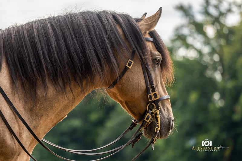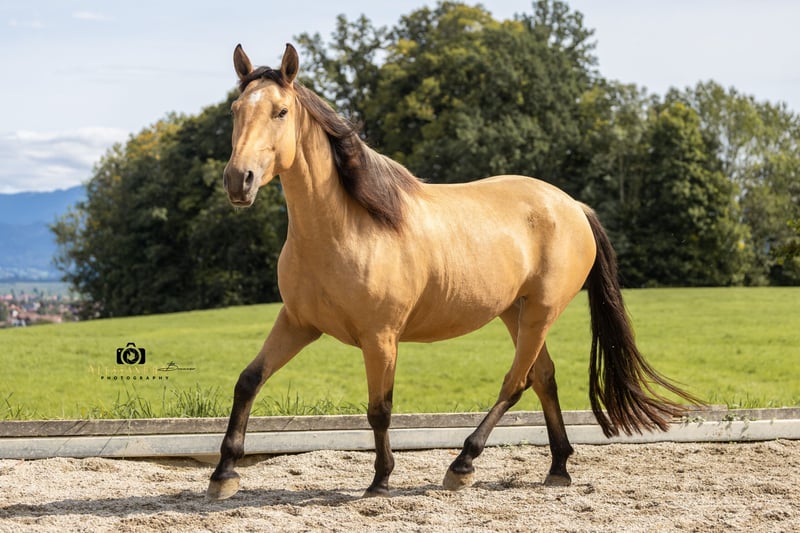 Im Züchterauftrag: Martini von Steinreb… …hier bietet sich die einmalige Gelegenheit eine überragende Allrounderin in Sonderlackierung zu erwerben, die durch ihr harmonisches Gangbild und ihre federnden Gänge durchaus beeindruckt. Diese charmante Falbstute stammt aus deutscher Zucht, wurde beim Bayerischen Spezialrassenverband als „Spanisches Sportpferd“ eingetragen und als Fohlen prämiert. Somit hat sie volles Papier, was sie wertvoll für die Zucht macht. Der Menschenkontakt von Tag eins und die qualitativ hochwertige Aufzucht machten sich hier klar bemerkbar und zahlen sich ein Leben lang aus. Martini ist eine in sich runde Persönlichkeit geworden, die immer überlegt handelt, aber dennoch weiß was sie will. Wer sie auf seiner Seite hat, für den geht sie durchs Feuer. Bei ihrer gesamten Ausbildung wurde viel Wert auf ein ihr geistiges und körperliches Niveau angepasstes Training gelegt. Ihrem Alter entsprechend ist sie korrekt in den Grundgangarten geritten, im Horsemanship und an der Hand gearbeitet und gymnastiziert. Selbstverständlich ist Martini auch vertraut mit der hofeigenen Geländestrecke sowie Gruppenausritten ins Gelände. Sie hat bereits bei einigen Kursen am Hof mitgemacht und kennt das typische Hoftreiben wie Kinder, Hunde, andere Pferde die kommen und gehen, Reiten in der Bahn mit anderen Pferden, das alles nimmt sie gelassen. Martini stammt von einem Pura Raza Española Hengst (Falbe, Stkm. 1.60m) und einer Polnischen Warmblut Stute (Fuchs, Stkm. 1.72m) ab. Sie ist stabil gebaut, rumpfig und deckt gut ab. Ihre Mutter war ein sehr zuverlässiges Lehrpferd, die sich als Allrounderin in der Reitschule bewährt hat. Ihr Vater ist in der klassischen Dressur weit ausgebildet. Er, sowie einige Ihrer Geschwister können gerne vor Ort besichtigt werden. Auf letzten zwei Bildern ist „Respetado VII“ zu sehen. Martini ist von Armateuren für die Bedürfnisse der im Hintergrund stehenden Reitschule selbst ausgebildet worden mit dem Fokus auf einen klaren Kopf, einen entspannten Körper und einen ehrlichen Charakter. Das ist die Basis eines jeden Freizeitpferdes. Reiterlich kann sie jetzt in jede Richtung weiter gefördert werden. Natürlich wurde sie regelmäßig entwurmt und war beim Hufschmied (Barhufer). Sollten Sie ein Pferd haben, welches Sie gerne verkaufen möchten, dann sprechen Sie uns einfach an. Wir kaufen, nehmen in Zahlung oder vermarkten Ihr Pferd für Sie bis zum endgültigen Verkauf. Weitere Infos unter www.wow-pferd.de