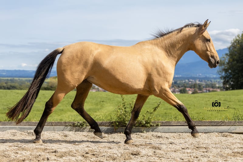On behalf of the breeder: Martini von Steinreb… …here is a unique opportunity to acquire an outstanding all-rounder in special coloring, who impresses with her harmonious movement and elastic gaits. This charming palomino mare comes from German breeding, is registered with the Bavarian Association of Special Breeds as a "Spanish Sport Horse," and was awarded as a foal. Thus, she has full papers, making her valuable for breeding. Her contact with humans from day one and the high-quality upbringing are clearly noticeable and pay off for a lifetime. Martini has developed into a well-rounded personality, who always acts thoughtfully but knows what she wants. For those who have her by their side, she would go through fire. Throughout her training, great emphasis was placed on a training program that is adapted to her mental and physical level. At her age, she is correctly ridden in the basic gaits, worked in horsemanship, and exercised on the ground. Of course, Martini is also familiar with the in-house trail course as well as group rides in the terrain. She has already participated in several courses at the stable and is accustomed to typical farm activities such as children, dogs, other horses coming and going, and riding in the arena with other horses; she handles all of this with ease. Martini is sired by a Pura Raza Española stallion (palomino, 1.60m) and a Polish Warmblood mare (chestnut, 1.72m). She is solidly built, compact, and has good coverage. Her mother was a very reliable school horse, proving herself as an all-rounder in the riding school. Her father is highly trained in classical dressage. He, as well as some of her siblings, can be viewed on site. The last two pictures show "Respetado VII." Of course, she has been regularly dewormed and has been to the farrier (barefoot). If you have a horse that you would like to sell, please feel free to contact us. We buy, take in trade, or market your horse for you until the final sale. More information at www.wow-pferd.de