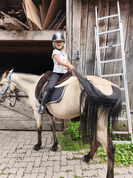 Small but very resilient Speed Racking Horse mare seeking her dream home. She is 5 years old, stands approximately 14.5 hands, and has four very smooth, clearly distinguishable gaits. She offers the tölt more easily when her energy level is higher, allowing her to increase to a canter tempo if desired. She has a lot of go, making her more suitable for experienced riders; however, she is also capable of carrying children (from age 6, who are even allowed to wave jackets around) comfortably. Initially, she was afraid of vehicles, but now cars are no longer a problem. She tolerates a bus at a distance of 10 meters quite well, though further work is needed here. Otherwise, she spends a lot of time in the field and is quite unshakable. She is familiar with groundwork, lunging, free work, as well as side passes from the ground and from above. Please feel free to contact me if you're interested.