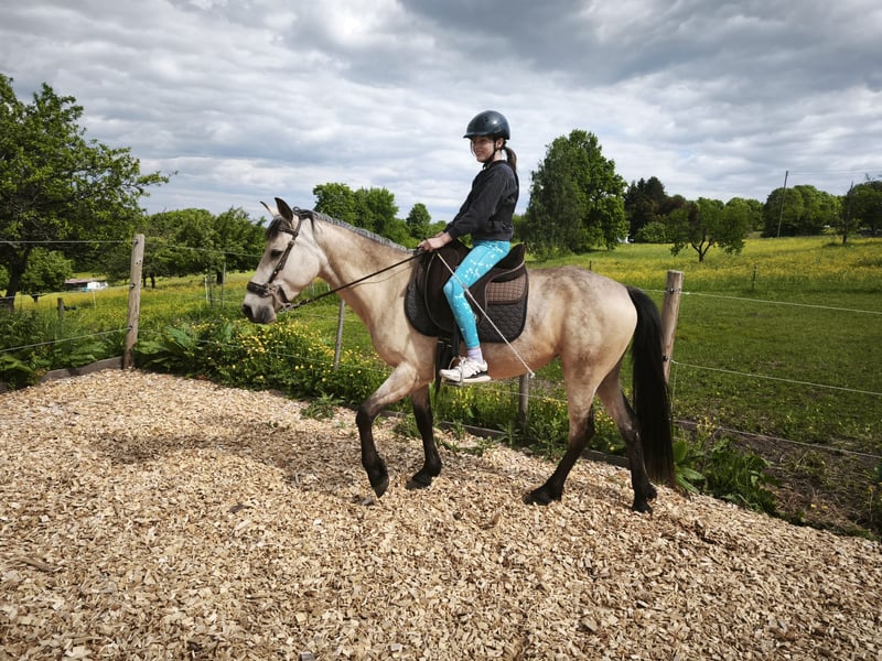 Small but very resilient Speed Racking Horse mare seeking her dream home. She is 5 years old, stands approximately 14.5 hands, and has four very smooth, clearly distinguishable gaits. She offers the tölt more easily when her energy level is higher, allowing her to increase to a canter tempo if desired. She has a lot of go, making her more suitable for experienced riders; however, she is also capable of carrying children (from age 6, who are even allowed to wave jackets around) comfortably. Initially, she was afraid of vehicles, but now cars are no longer a problem. She tolerates a bus at a distance of 10 meters quite well, though further work is needed here. Otherwise, she spends a lot of time in the field and is quite unshakable. She is familiar with groundwork, lunging, free work, as well as side passes from the ground and from above. Please feel free to contact me if you're interested.