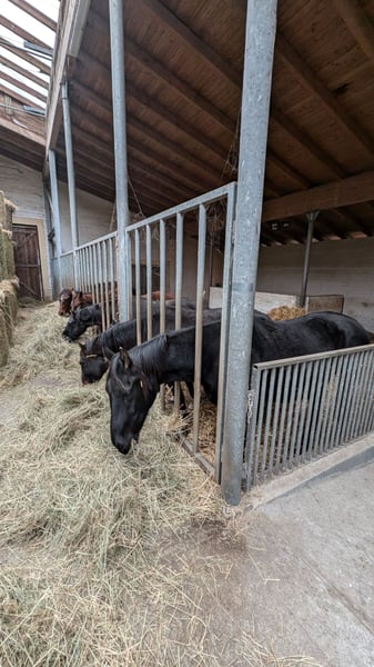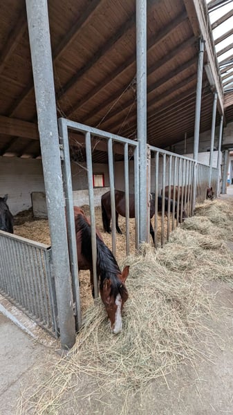 Wir haben mehrere große Laufställe, in denen junge Pferde überwintern können. Auch für die grüne Saison gibt es ausreichend Weidefläche die selbigen unter zu bringen. An den Laufställen grenzt direkt 24Stunden-Auslauffläche an. Wir füttern qualitativ hochwertiges Heu und es wird regelmäßig mit gutem Stroh gestreut. Der Hufschmied ist regelmäßig bei uns für die Hufpflege.