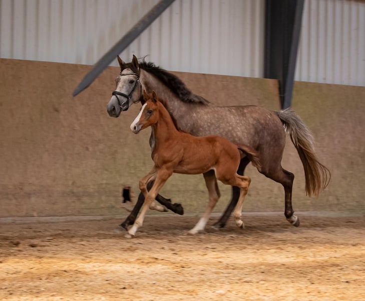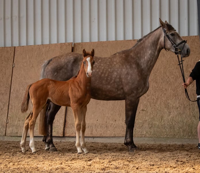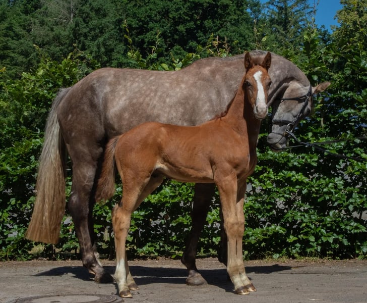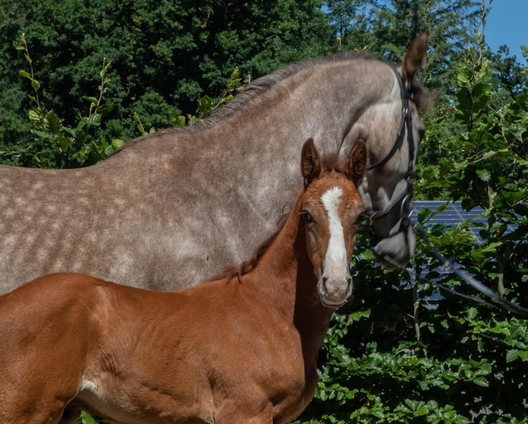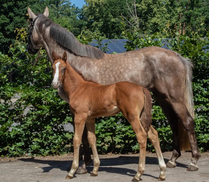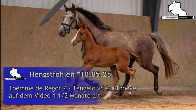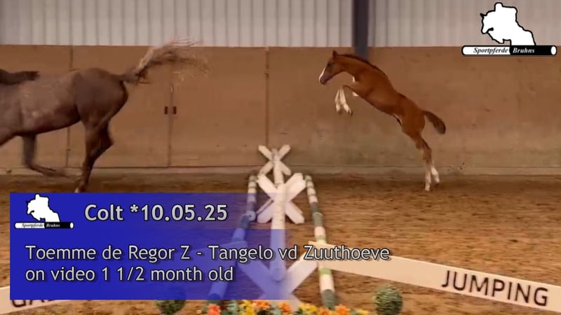 We are offering here an interestingly bred show jumping colt from our best bloodline. This young, energetic, and lively colt already knows where the piano is and shows great promise. The grandmother, Lene, by Levisto, is the dam of the 1.60m level successful mare "Call me Princess" and the grandmother of the 1.55m successful mare "Great Princess." The sire, "Toemme de Regor Z," with Chacco Blue, Cento, and Nabab de Reve, is linebred for Grand Prix potential and is considered a promising prospect at Zangersheide. The dam's sire, "Tangelo vd Zuuthoeve," and "Levisto" are also well-known worldwide as excellent jumping bloodlines.