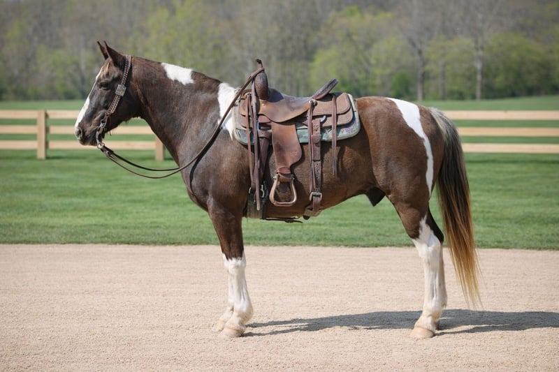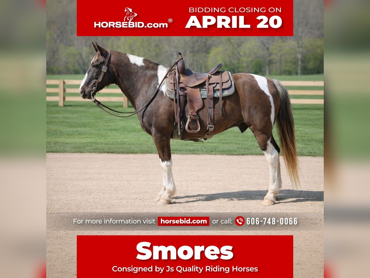 ⚜️𝐭𝐡𝐞 𝓔𝓵𝓲𝓽𝓮 𝐒𝐩𝐫𝐢𝐧𝐠 𝐂𝐥𝐚𝐬𝐬𝐢𝐜⚜️ Happening now thru MONDAY | APRIL 20th - Available EXCLUSIVELY on HorseBid's website! For more details and to register visit: www.Horsebid.com CONSIGNOR CONTACT: Js Quality Riding Horses 606-748-0066 LOCATION: Wallingford, KY BREED: Spotted saddle horse REGISTERED: No REGISTERED NAME: Smores COLOR: Chocolate and white HEIGHT: 15 AGE: 12 GENDER: Gelding We are proud to introduce “Smores” a 15 hand 12 years young spotted saddle gelding. Smores is the kind of horse you wanna go out and ride, whether it’s 70° and the sun is shining or -2° and snow falling. Smores has a good solid walk, a beer drinking gait, and even can lope like a quarter horse if asked. There’s not a hill to steep or a creek to deep, s’mores is ready to hit the trail and get you wherever your wanting to go safely and smoothly. Smores has a good smooth gait that will get you wherever your heart desires , in a safe, fashionable, and comfortable manner ! Wanna drop your reins, enjoy a cold one while hitting the trails? Smores is your guy ! Smores stands to be mounted, saddled, bridled, he stands good for the farrier and loads with ease. S’mores is a trail superstar, but he also is wonderful in the arena and will work the rail , circles, or whatever else you may want. Want to go to the obstacle courses ? Fun shows ? Smores got you covered ! Smores is built to last, he’s sturdy made like a stock horse, big boned and has good solid hooves to last a lifetime ! S’mores has a good neckrein to him, he stops on whoa, and will ride around like a quarter horse. Smores stays broke with time off, he will ride out alone or by himself and doesn’t care to lead the trail or follow behind. S’mores has been rode all over national forests and has experience in all terrains. If your wanting a good safe solid trail mount, or a fancy gelding to hit the arena on, look no further s’mores is ready for his next adventure!