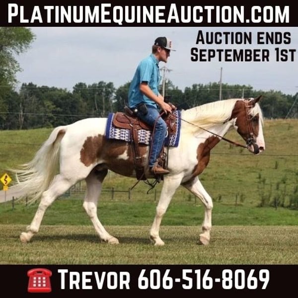 ONLINE AUCTION Place your bids at www.PlatinumEquineAuction.com Starting Bid $3500 Auction ends September 1st, 2024 Need a new saddle? Check out White Rock Saddles on our website or Facebook! Scout is an eye catching sorrel roan tobiano, Missouri Foxtrotting/Tennessee Walking Gelding gelding that is standing 15.2-15.3hh and 4 yrs old. Scout has been on camping trips, picket line tied and hauled to several states. He will flatfoot walk on a loose rein or he can move on out if you ask. He has a smooth and natural 4-beat gait that anyone will enjoy riding on! Scout has been shown at local fun shows in pleasure classes and seen it all from the bright lights to hearing those blairing loud speakers. Scout has seen it all and handles everything in stride! He has been exposed to all kinds of wildlife such as deer or turkey or other animals like cows or dogs and will go anywhere that he is asked to. He has been rode many miles in the mountains of Eastern Kentucky and encountered every obstacle possible on the trail. He will go up or down even the steepest slopes, across deep creeks, over downed trees, and over all types of rough terrain while still being sure footed. He has been rode in traffic, and is very traffic safe around cars, semi, log, and dump trucks. If you are looking for that special trail riding partner, then look no further!! Feel free to call Trevor Patrick 606-516-8069 with any questions. ONLINE AUCTION Place your bids at www.PlatinumEquineAuction.com Starting Bid $3500 Auction ends September 1st, 2024 Need a new saddle? Check out White Rock Saddles on our website or Facebook!