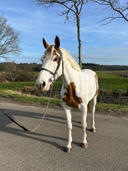 COCO CLACHARD (Clochard x Zirocco Blue x Quidam de Revel) Coco is a 4-year-old piebald show jumping mare with a height of 166cm. She is a mare with a kind and down-to-earth character, even under saddle. Currently, we are competing with her in the 1.00m, and she does this very well and is pleasant to ride in the course. In dressage, she is also well-behaved and easy to ride. 100% traffic-safe and very well-behaved in the woods. If you have any questions or are interested, please message, call, or email using the contact details below. 0682393901 Sleejenneke9@gmail.com