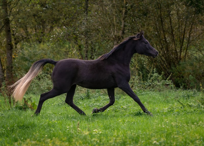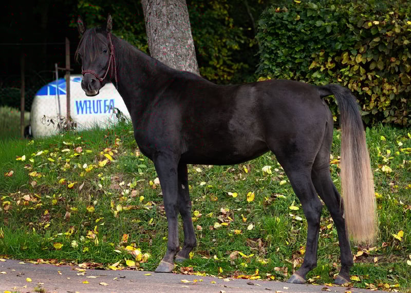 Aisha is a stunning, well-built, purebred black Egyptian Arabian mare with a sweet, human-oriented character and an intriguing pedigree that makes her highly interesting for breeding. She has correct conformation, solid foundations, a harmonious body, and a good topline. Her refined, typy, dry face features large, expressive dark eyes and a delicate muzzle. Her head flows smoothly into a refined neck and a well-shaped, elegant neck. Her strong body, with well-angulated shoulders and hips, and a good topline, stands on correct legs with very good hooves. A special color highlight is her silver tail hair, a genetic trait inherited through the maternal line (not Rabicano). Her movements are expansive, elastic, and lively, with three well-defined basic gaits. She is very calm and nerve-strong. Aisha has a gentle character, enjoys cuddling, and seeks to please. She is intelligent, quick to learn, and eager to pick up new things. Her interesting pedigree and homozygosity for the black gene make her especially appealing for Arabian breeding. She is free from the genetic defects CA, SCID, and LFS. All these qualities make Rania very promising as a future broodmare. She also shows great potential as a riding horse for endurance and demanding leisure riding. She will be a loyal companion you can rely on through thick and thin. Both her parents are good riding horses. Aisha is familiar with ground work, hoof care, trailer loading, children, cattle, cats, dogs, large machinery, traffic, etc.—in short, everything a young horse should know. She was raised in a herd and is very well socialized. Upon request, Aisha can be bred to one of my purebred Egyptian Arabian stallions, guaranteeing a black purebred Egyptian foal.