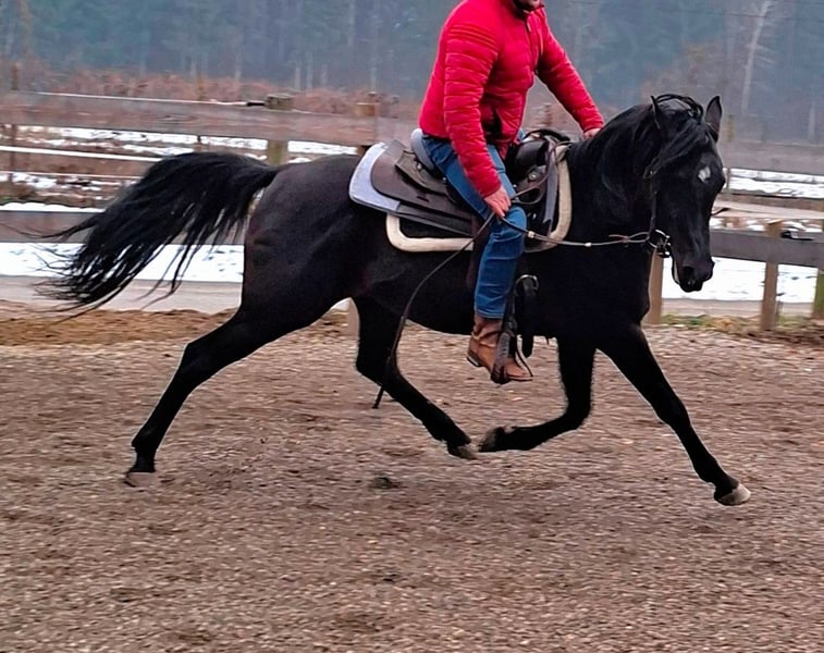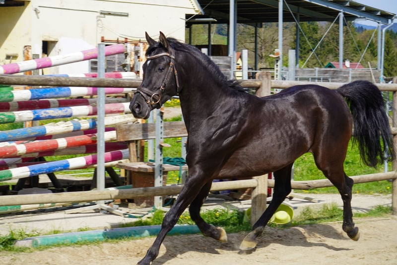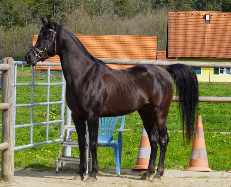 5-year-old Egyptian black stallion without markings for sale. He has been raised in a species-appropriate manner with us and spent the last summer on alpine pastures with other stallions. He is currently in training. In terms of character, he is very reserved towards strangers, but once he has built trust, he allows everything to be done with him. He is currently in training, which is somewhat challenging at the moment due to his hormones. He will only be sold to knowledgeable individuals of this specific breed. Due to his lineage and correct conformation, he could also be considered for breeding; otherwise, keeping him as a gelding would be better for him and his future owner. Since we have several half-sisters of his, a trade for an unrelated black stallion could also be considered.