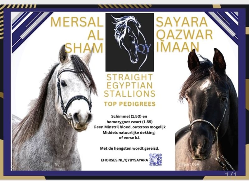Straight Egyptian Arabian Warmblood, Imported from the USA, homozygous black, for breeding purposes. AVS NL registered. Qaz is a handsome young stallion with strong and correct conformation. He measures 155 cm and is just over 3 years old as of September 2025. Homozygous black rabicano. He inherited the luxurious mane of his grandsire, Sheik Imaan. He has a very stable temperament, very calm in his demeanor. Not nervous, no squealing. Good with younger horses, respectful towards mares. This year, his first foal will be born in the USA. The mare was pregnant after the first breeding attempt. Professional photos and videos will follow in spring. Qadir is also available; a straight Egyptian grey stallion, 150 cm, top-line. Breeding fee €1100. See other listing. Available for natural coverings. Fresh semen at K.I. station also possible. Travel arrangements with the stallion(s) can be made upon request (NL, DE, BE, Austria, Switzerland, Slovenia, Croatia). Costs for fresh semen K.I. or travel to the mare/stallion (with foal) are additional and are the responsibility of the mare owner. Transportation of the mare to QY can also be arranged for a reasonable fee. Foal guarantee: if a colt is born, you will receive the next breeding at half price. Live foal guarantee. **Apart from the covers covered by the guarantee, no repeats of matings will be made. This ensures your foal has an exclusive pedigree.** Serious, neat inquiries will receive a serious, professional response. Please preferably contact via WhatsApp +31 610 271771. Anonymous or random questions here will not be answered. Your first name and phone number are appreciated.