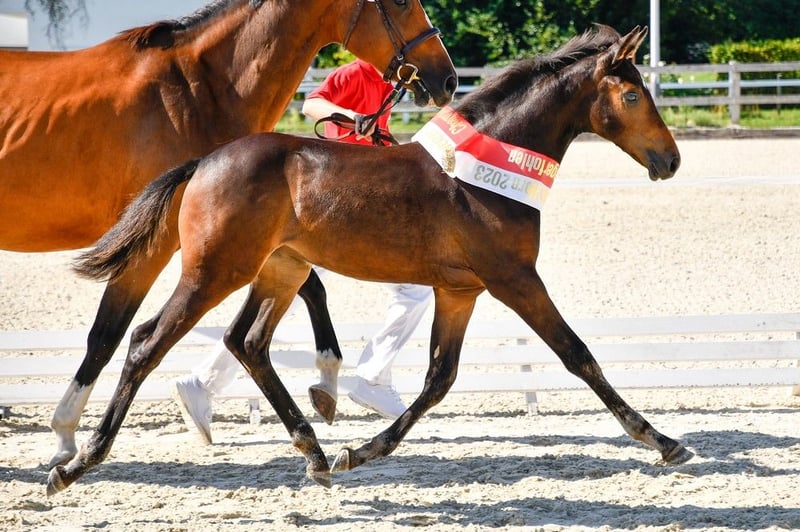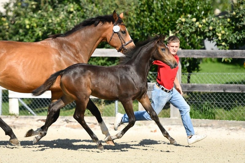 Zinella is a stunning mare by Zinedream out of Coronino, who already impressed as a foal. At six months old, she qualified for the Foal Championship in Avenches with scores of 9/8/8 (type/conformation/gait). She is very friendly, curious, and still a real eye-catcher. She has not yet been backed, but she is accustomed to trailer transport, hoof handling, leading exercises, etc. Her height is approximately 16.1 hh, and she is still growing. Further information or viewing available upon request.