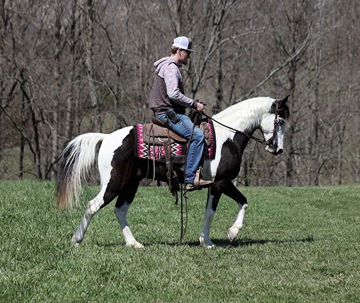 ONLINE AUCTION Place your bids at www.PlatinumEquineAuction.com Starting Bid $3500 Auction ends July 28th, 2024 Need a new saddle? Check out White Rock Saddles on our website or Facebook! Taco is an eye catching black/white tobiano, gelding that is standing 14.1hh and he is 10 yrs old. Taco has been on camping trips, picket line tied and hauled to several states. He will flatfoot walk on a loose rein or he can move on out if you ask. He has a smooth and natural 4-beat gait that anyone will enjoy riding on! He can gait on out around 10mph or walk on a loose rein as well. Taco has been shown at local fun shows in pleasure classes and seen it all from the bright lights to hearing those blairing loud speakers. Taco has seen it all and handles everything in stride! He has been exposed to all kinds of wildlife such as deer or turkey or other animals like cows or dogs and will go anywhere that he is asked too. He has been rode many miles in the mountains of Eastern Kentucky and encountered every obstacle possible on the trail. He will go up or down even the steepest slopes, across deep creeks, over downed trees, and over all types of rough terrain while still being sure footed. He has been rode in traffic, and is very traffic safe around cars, semi, log, and dump trucks. If you are looking for that special trail riding partner, then look no further!! Feel free to call Trevor Patrick 606-516-8069 with any questions. ONLINE AUCTION Place your bids at www.PlatinumEquineAuction.com Starting Bid $3500 Auction ends July 28th, 2024 Need a new saddle? Check out White Rock Saddles on our website or Facebook!