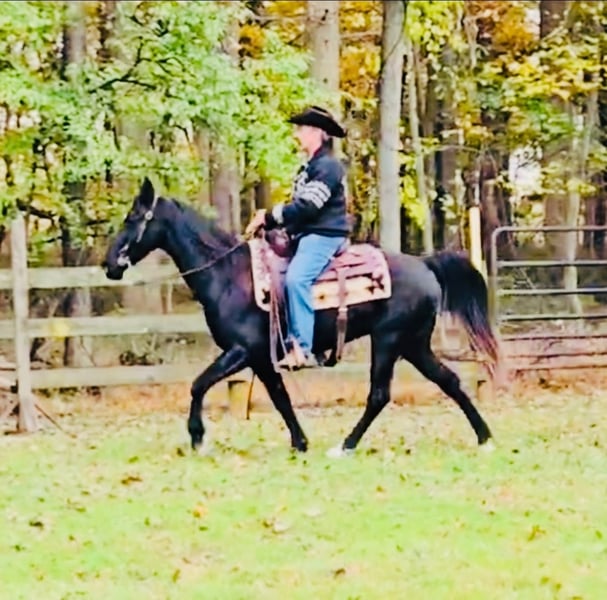 "AVAILABLE ON ONLINE HORSE AUCTION AT www DOT MagicHorseAuction DOT com BIDDING OPEN NOW thru TUESDAY | December 9TH! - BUY IT NOW AVAILABLE! *Final price will be determined on auction site* CONSIGNOR CONTACT INFO: John Flaugher 717-414-4211 LOCATION: Waynesboro, PA Black Bart is a fancy black Tennessee Walking Horse gelding that stands 15.1 hh and is 12 years old. he's good broke and great on the trails with enough steam to take you on all day trail riding adventures. Bart has been shown and trail ridden all over. He crosses logs, bridges, streams and is good on the roads with traffic. Bart gets along with both mares and geldings in the field. He ties anywhere with no problems and jumps right on the trailer. Don't miss this stunning gelding that's always an eye catcher anywhere we've taken him. Bart sells with a fresh vet exam of soundness, new coggins test, just had his teeth floated on 10/23/2025 and got 4 new shoes. He was updated on all his vaccinations on 10/31/2025. He is Nationwide transportation is available.