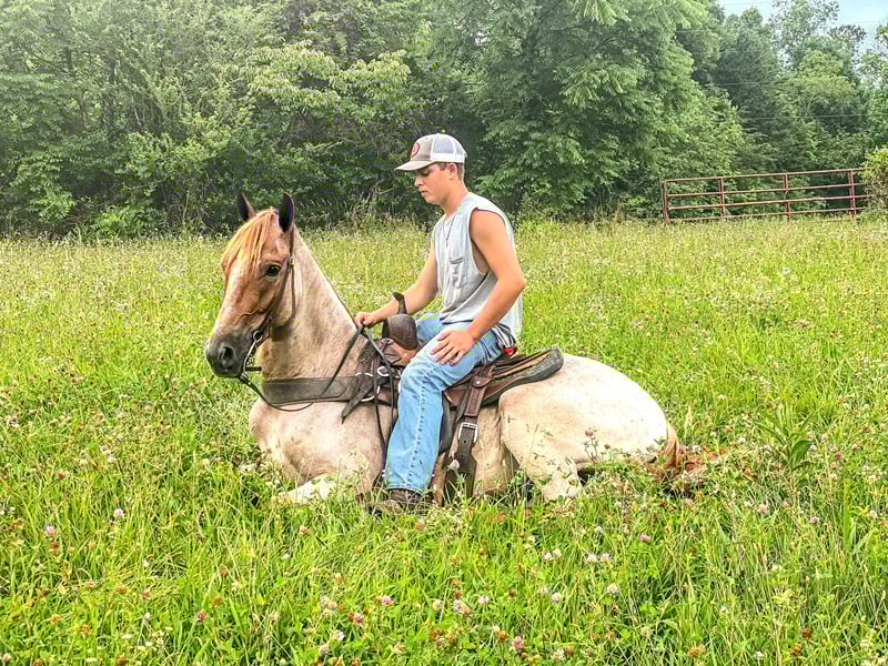 Redington Steel aka Steele Man is a 4yr old registered red roan gelding that stands 15.1hh. I cannot say enough good things about this guy. Steele man has been ridden many miles in the Big South Fork, as well as the beaches of Florida. For a 4 year old horse, he has been put through the obstacles, on overnight camping trips and is willing to please. This nice young gelding is suitable for almost any level rider. He will walk on a loose rein all day, or step up and ride when asked. He has no problem riding out alone or in large groups. Steele Man will carry your saddle bags, chain saw, or anything you need and still ride just the same. He is focused on one thing, and that’s his job. He isn’t gun shy, and as you can see from the video is not shy from loud noises or tarps. We have threw firecrackers, and other large fireworks off of Steele Man, and he did nothing but a small flinch as shown. ATVS, Motorcycles, and other farm equipment do not bother him. Steele man is the kind of guy you can take out an enjoy all day, or throw your non horse friends on and not have to worry about. He has no problem crossing creeks, steep hills or large ditches. He is a gentleman for mount and dismount, and will stand until asked to step off. He stands to be bathed, clipped and for the farrier. Steele Man has all the looks, color and brains you could ask for, all wrapped up in a young horse to last a lifetime