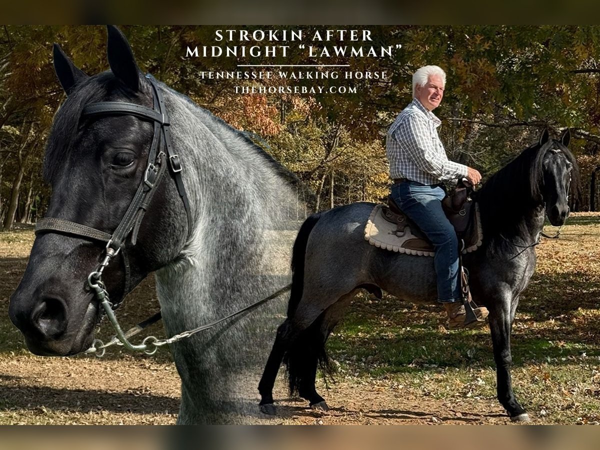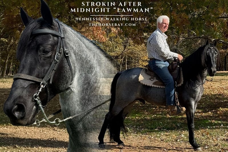 I am especially proud to present Lawman, one of my all-time favorite horses. This registered Tennessee Walking Horse is a gleaming silvery blue roan, and his super-thick mane and tail are a luxurious velvet black.