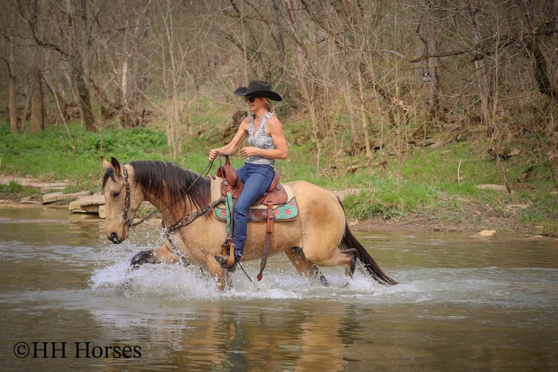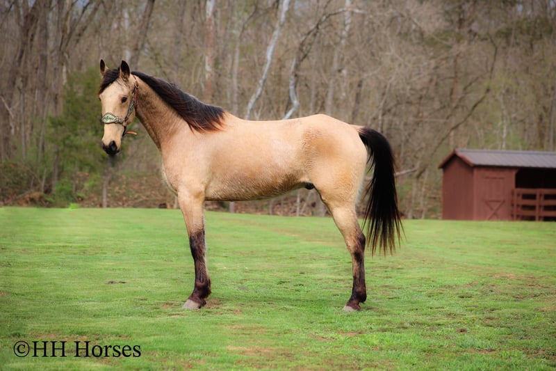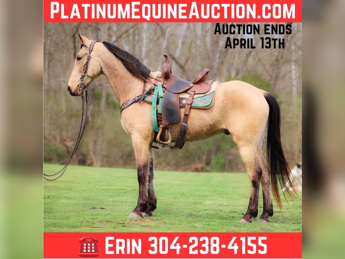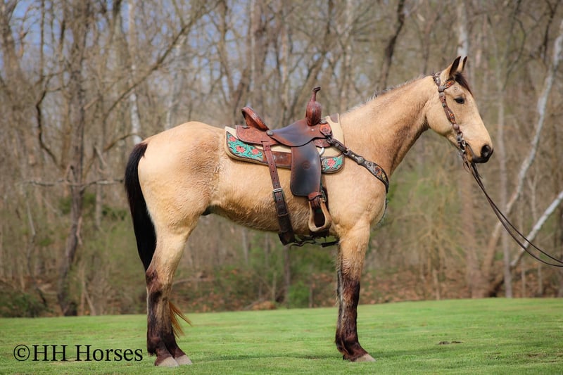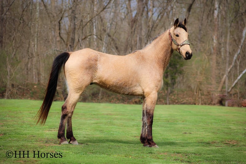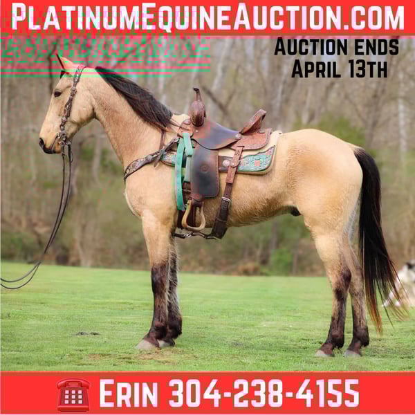 ONLINE AUCTION Place your bids at www.PlatinumEquineAuction.com Starting Bid $3500 Auction ends April 13th, 2025 Need a new saddle? Check out White Rock Saddles on our website or Facebook! This is “VIA’S SPIRIT OF THE CHIEF”, a registered BUCKSKIN TENNESSEE WALKING HORSE GELDING that is well broke and extra fancy. This gelding is naturally gaited and super smooth. He is 7 years old and stands 15 hands tall. He has been through the deep water, up and down in the mountains, and through the timber. He is good to work around and stands to tack, mount, and groom. He will walk out nicely on a loose rein, has a smooth gait, and will canter when asked to. He is easy to stop and easy to turn. He is obedient, well mannered, and he aims to please. If I was going to have a gaited horse to keep to ride, he would be the one. He has color, style, build, and he is sure footed through the rocky stream beds. He is brave and confident riding out alone. This gelding will also ride in a group and doesn’t care if he is in the back or the front. He is fine with dogs, tractors, and side by sides. He is a super cool registered gelding with color, ride, style, and ability. If you have any questions or would like to make a Buy It Now Offer contact HH Horses Erin 304-238-4155 Located in Flemingsburg, KY. ONLINE AUCTION Place your bids at www.PlatinumEquineAuction.com Starting Bid $3500 Auction ends April 13th, 2025 Need a new saddle? Check out White Rock Saddles on our website or Facebook!