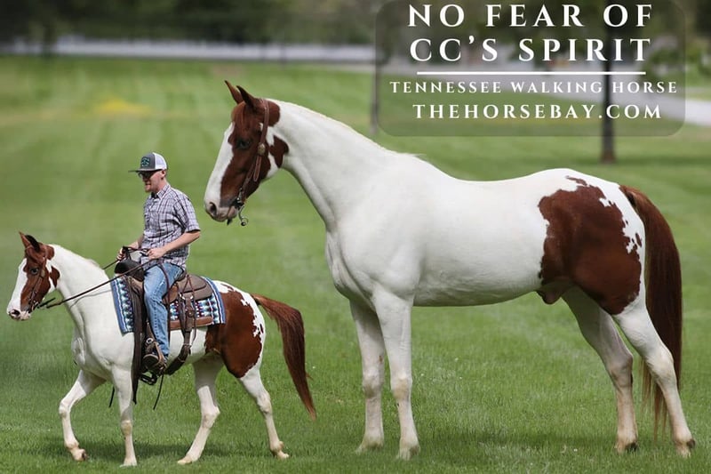 Take a look at CC, which is an eye-catching Red/White Tobiano gelding that is a registered Tennessee Walking Horse and Spotted Saddle Horse. He is standing around 15hh and is 9 years old. CC has all the experience anyone could ask for but is young enough to do it all again! CC is a super fun horse to ride as he glides along! He has a true 4-beat gait that is smooth for any rider at all speeds, up to 10 mph. CC has been ridden in several states, from Tennessee to Indiana. He has seen everything imaginable and handles everything in stride! He has been exposed to a wide range of wildlife, including deer, turkeys, and other animals like cows and dogs, and will go anywhere he is asked to. He has ridden many miles in the mountains of Eastern Kentucky and encountered every obstacle possible on the trail. He will go up or down even the steepest slopes, across deep creeks, over downed trees, and all rough terrain while still being sure-footed. He has been ridden in traffic and is very traffic-safe around cars, semis, logs, and dump trucks. If you’re looking for an amazing trail partner… CC is the horse for you!