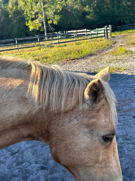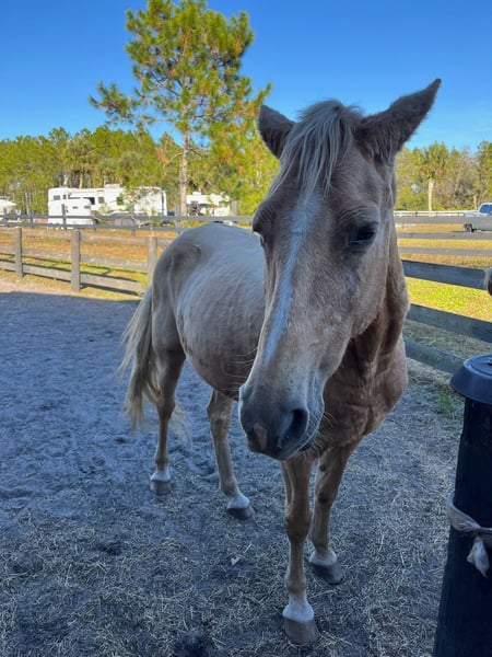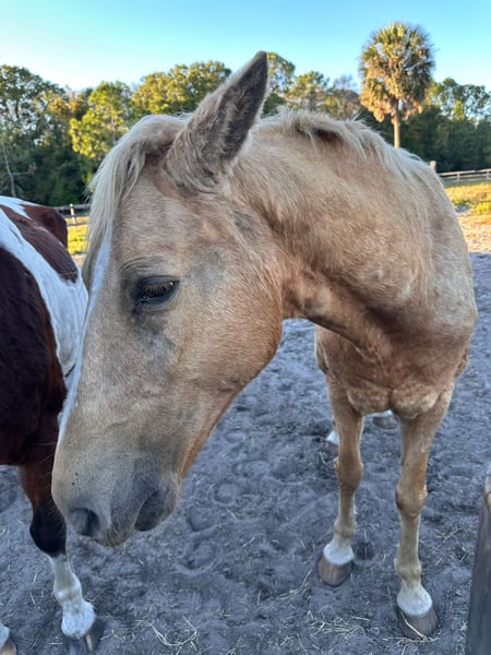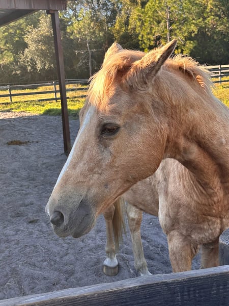 If you are looking for a flashy, smooth-moving partner with the "old soul" temperament of a Heritage-bred walker, meet Dixie. She is a stunning 15-16 year old Palomino mare who turns heads with her golden coat and refined, pretty head. 🐴 The Ride & Gait Dixie is the definition of a natural gaited horse. She boasts a true, four-beat walk with a rhythmic natural head nod and a ground-covering running walk. * The Disposition: Dixie is a "easy-going" soul with a friendly, calm personality. * Current Status: Due to owner illness, Dixie has not been under saddle for approximately 1.5 years. Because she is currently "out of work," she is best suited for an experienced rider who can give her a light refresher to bring her back to her full potential. * Keep: Dixie is a hardy, low-maintenance mare. She lives 24/7 on the pasture, not in a barn. She is well-acclimated to the Florida elements and thrives in a natural outdoor environment. ✅ Health & Maintenance Dixie is current on all her professional care and ready to transition to her new home: * Coggins: Negative (Current as of 1 month ago) * Vaccines: Up to date (Done 1 month ago) * Hoof Care: New feet/trimmed (Done 1 month ago) Dixie is a beautiful, heritage-bred mare who just needs a job again. She’s been a wonderful companion on the property, but she deserves a rider who can get her back on the trails. Call or text owner, Mike Darnall or his secondary contact, daughter Brittany.