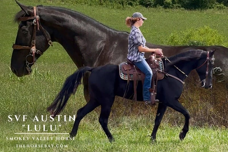 Meet Austin “Lulu”! A stunning 6-year-old Smokey Valley Mare, standing at an impressive 16.1hh, with a sleek, all-black coat. This powerful and athletic mare defines what it takes to be a Performance Trail Horse. Bred and trained right here at Smokey Valley Farms to conquer challenging terrain with ease, making her the perfect partner for riders seeking an exhilarating trail experience. Austin “Lulu” is best suited for an intermediate or advanced rider with an independent seat and hands, as she requires finesse and confidence to unlock her full potential. Unlike a typical nose-to-trail horse, Austin is not your average slow and steady mount; she’s an athlete with an excellent forward drive that needs no extra encouragement from her rider. Her willing-to-please temperament makes her a joy to work with, as she eagerly responds to a confident rider who can put her to work. She thrives on challenging trails, having traveled to and conquered rugged landscapes across Kentucky, Montana, Arizona, and Michigan. Strong, tall, and versatile, Austin is ideal for riders of all sizes, offering both power and softness. Her natural enthusiasm and sure-footedness make her exceptional for navigating tough terrain, while her responsive nature is a great payback to riders who can guide her with skill and assurance. For the rider ready to harness Austin’s energy and unlock her potential, she offers an unmatched trail riding experience that is both thrilling and rewarding Another one of Austin’s great attributes is her natural 4-beat gait with a significant over-stride, which Smokey Valley Horses are renowned for. Utilizing this gait gives Austin the advantage to cover more ground than a typical trail horse while still achieving maximum comfort for her rider. It’s no surprise that Austin can take you down the winding road for hours, and anyone in her saddle experiences little to no fatigue afterwards! Austin “Lulu” has solid ground manners. She will stand for the farrier and vet with patience, and also shows this level of patience at the mounting block, making it easy for her riders to mount and dismount despite her 16.1hh height. She is also no stranger to the horse trailer and will confidently load and unload trailers, with no drama or stress, while hauling to locations all over the country. At Smokey Valley Farms, we hold our horses to a high standard of being traffic safe and aware of what most trails can bring, whether that is a car, truck, motorcycle, dogs, guns, tractors or farm equipment our horses like Austin, will not even give these obstacles a second thought and proceed with confidence in any direction you point her too.