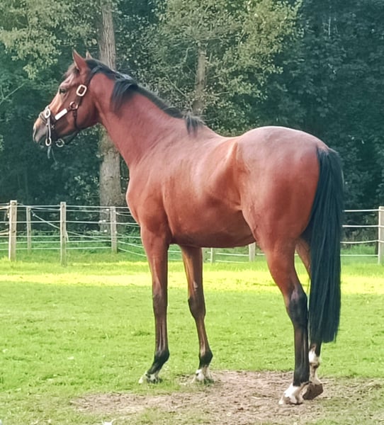 This 2-year-old gelding by Best Solution out of Rustica is confident and spirited. Due to the intentionally delayed castration, which took place in October 2025, he is developmentally above average for his age. His compact build, pronounced musculature, and ambitious gallop already impressed as a yearling, and his pedigree from some of the most successful stallions in thoroughbred breeding was evident even then. His sire, Best Solution, is known for passing on his quality, with his grandsire being the internationally successful stallion Kodiak. Offspring of Best Solution have demonstrated their class through their victories and are highly sought after at auctions. The 2-year-old is currently undergoing pre-training at Schloss Arrff and will begin formal training afterward. The main photo shows the gelding at Schloss Arrff in October 2025. The following image was taken in September 2025 at his home pasture, alongside his successful 8-year-old "brother," Red Storm (by Kamsin out of Rustica). The last photo, from September 2024, shows the gelding as a yearling, already making a strong impression. Further details can gladly be discussed in an initial phone call.