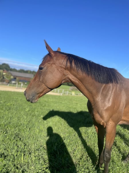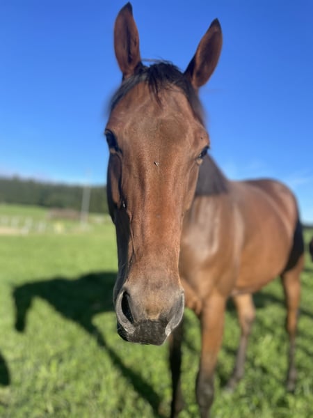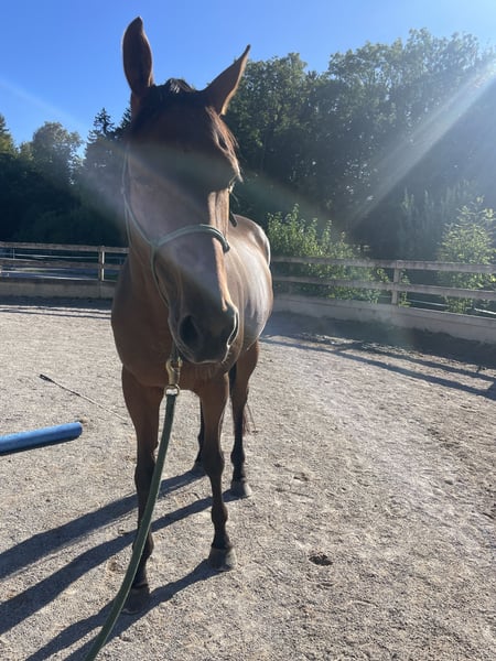 Lucky Moon is a very gentle, human-oriented gelding who is always up for a good time – as long as it’s with his person! He enjoys his work, loves being fussed over, groomed, and cuddled. In everyday handling, he is straightforward and well-behaved when being groomed, led, or when visiting the farrier. He is familiar with trailer loading, though he doesn’t do it often, and it’s no problem for him. He lives in a herd but is not clingy to other horses. Sometimes he can be a bit cheeky, but he is never “naughty.” Lucky Moon has been ridden in all three gaits according to his age and is familiar with dressage work in the arena. His training is quite varied, with horsemanship as the foundation for optimal communication. We also work with him from the ground, which he enjoys. He is very sensitive and learns quickly. He also enjoys liberty work. He is very receptive to people, always friendly, and extremely eager to do his best. He is now looking for a loving home with a kind person or a family. Lucky Moon has a strong work ethic and plenty of ambition. He suits someone who enjoys spending time with a nice animal and wants to start a future together. He is the perfect leisure horse for riding, groundwork, long walks, dressage, and working equitation. He loves having tasks set for him.