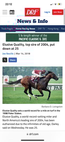 6. zdjęcie to jej ojciec. 7. zdjęcie to jedno z jej 2 źrebiąt. Jej drugie źrebię dobrze radziło sobie w jeździectwie skokowym we Włoszech. Sama podróżowała po świecie w wyścigach konnych.