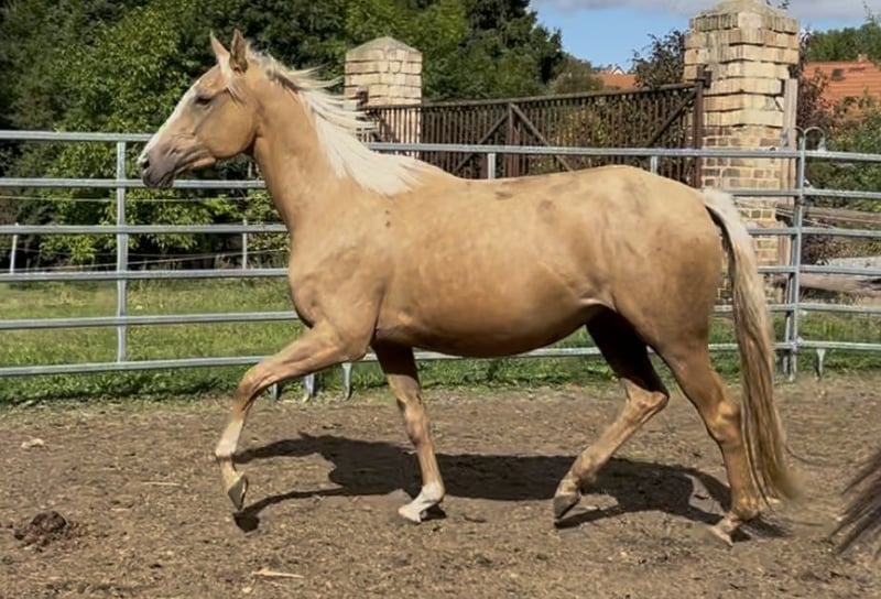 Palomino Thoroughbred mares with W20 genes are quite rare. Normally, this mare is worth a lot, but she has a handicap that limits her riding ability and also affects breeding! We have her mother here in the breeding program and also 3 other siblings! For more information, feel free to message us!