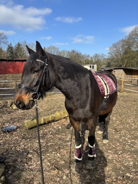 Unfortunately, my mare Stella is looking for a new owner. I’ve realized that despite my best efforts, we are not truly compatible, and our relationship tends to be more confrontational than harmonious. She is a Thoroughbred cross, 6 years old (born in 2020), standing approximately 1.60 meters at the withers. For the past year, I have only worked with her on the ground. She is very motivated in these exercises and responds well to body language and voice commands. However, she clearly shows signs of stress if she feels overwhelmed. She is already backed, but anyone wanting to ride her should proceed gradually and patiently. I also want to mention that Stella is not suitable for long-term or competitive riding due to soft tendons and is not a weight-bearing horse. She has no issues with saddles or tack. At the grooming area, she is very relaxed and thoroughly enjoys being groomed. She is shod (front shoes), but needs a gentle push when loading onto a trailer or horsebox. In the terrain, she needs targeted training again, as she tends to become easily nervous. She requires someone she trusts deeply, and I sense that this trust is currently lacking between us. She can only be kept in a suitable open stable with a herd, preferably mixed. I am looking for a sensitive person for this mare—someone who can read her well, support her development, and ensure she is happy. Additional equipment can be purchased if needed.
