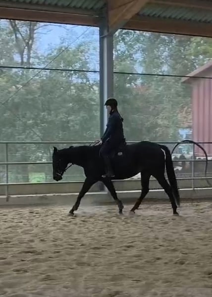 Fearless Trail Partner with Potential for More For sale is a 5-year-old Thoroughbred mare with approximately 16.0 hands. She has been ridden recreationally and is solidly backed. She confidently handles walk, trot, and canter in the arena and responds very delicately to the smallest aids. In the field, she is completely fearless, willingly leads the way, and remains calm on new routes. Cows, tractors, cars, or cyclists are no problem for her at all. Due to her young age, she is not suitable as a beginner horse at the moment. However, with proper training and encouragement, she will undoubtedly become a wonderful partner – she is very eager to learn and picks things up quickly. Unfortunately, she does not feel comfortable in her current stable, which is why we are looking for a new, suitable home for her. Due to her position in the herd (low rank), she sometimes shows a bit of stall vices, for example when tacking up. This also causes her to become increasingly impatient and she has started to test her rider by not moving forward during riding. She is only to be placed in experienced, caring hands – quality over price. We are looking for someone who gives her time to settle in and works with her consistently but fairly. Ideally, she would have a box with all-day turnout, so she can relax and develop optimally. If you are interested, we look forward to hearing from you.