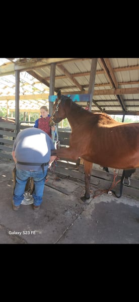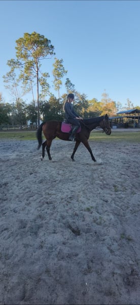 She is so sweet, stands for farrier. Loads up each ride She gets better. I gave her some time off after the track, and then we started lunging and building a lot of muscle strength and undersaddle. We walk, try and canter in circles and also here, and there over some jumps this horse, it's going to be an amazing Hunter eventer even show jumping and dressage type of horse. Our first jump has been a log if you're looking for a project that wants to try a hardest for you. This is her message me if interested. Thank you.