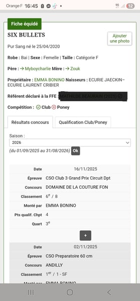 🐴 Six bullets 🐴 Cette magnifique princesse a 5 ans. Elle fait environ 1m63. Elle ne convient pas à un cavalier débutant, car c'est une jument de 5 ans qu'il faut continuer de former. Mais adorable et très gentille. La dame dresse (travail de deux pistes( video) )et fait du travail à pied. Elle va en balade, seule ou accompagnée, et saute bien (vidéo de sont 1er concours après la 4eme fois qu'elle sautait de ça vie). C'est une jument non regardante qui aime sauter. Elle a déjà fait quelques concours de saut où elle gère son stress à la perfection et se montre agile sur les barres. Fait de la thérapie animal avec des enfants, personne en situation de handicap (video). C'est une très gentille jument qui veut apprendre et faire plaisir à son humain. Par contre, si on veut aller trop vite avec elle ou que l'on est trop dur avec elle, elle n'hésitera pas à le faire savoir. Elle n'a peur de rien et adore que l'on s'occupe d'elle et la poupouille. À jour de tous (ostéo, dentiste, vaccins, etc.). Elle fera le bonheur d'un cavalier qui cherche un cheval à continuer de former et qui souhaite créer un lien. Elle voyage à la perfection. Vit en pré en groupe à Écouen 95. Jument pur sang et fière de le dire, car c'est une jument plein papier qui pourra facilement faire de l'amateur par la suite, avec un super mental et caractère. ⭐️ 5🥕🥕🥕 évolutif avec le travail, négociable dans le raisonnable. Possibilité de payer en plusieurs fois.