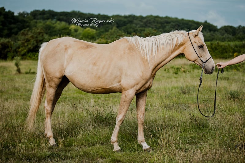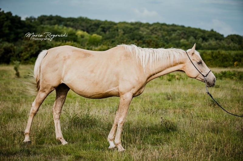 Volbloed paard | Palomino (e/e Cr/n) | Geboren in 2018 | Ongeveer 157 cm Deze zeldzaam gekleurde volbloed merrie komt uit de gerichte kleurlijn van het Falkenhorst-station. Als dochter van de palomino-gekleurde volbloedhengst Royal Valentine en de goudkleurige merrie Isteni Arany combineert ze sportbloed met opvallende genetica. IFIGENIE GF draagt het eenvoudige Cream-gen en heeft een harmonieuze lichaamsbouw met een typisch volbloedtype. De exacte verdeling van de Agouti-component is tot nu toe niet genetisch getest. Ze is momenteel niet onder het zadel en leeft in een diervriendelijk kuddebeheer.