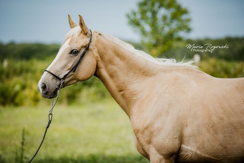 Koń pełnej krwi angielskiej | Palomino (e/e Cr/n) | urodzony w 2018 roku | około 157 cm Ta rzadko ubarwiona klacz pełnej krwi angielskiej pochodzi z selektywnej linii hodowlanej stajni Falkenhorst. Jako córka palomino-owatego ogiera pełnej krwi Royal Valentine i złocistej klaczy Isteni Arany łączy sportowe pochodzenie z efektowną genetyką. IFIGENIE GF nosi prosty gen Cream i charakteryzuje się harmonijną budową ciała oraz wyraźnym typem pełnej krwi. Dokładny rozkład komponentu Agouti nie został jeszcze genetycznie zbadany. Obecnie nie jest pod siodłem i żyje w odpowiednich warunkach stada.