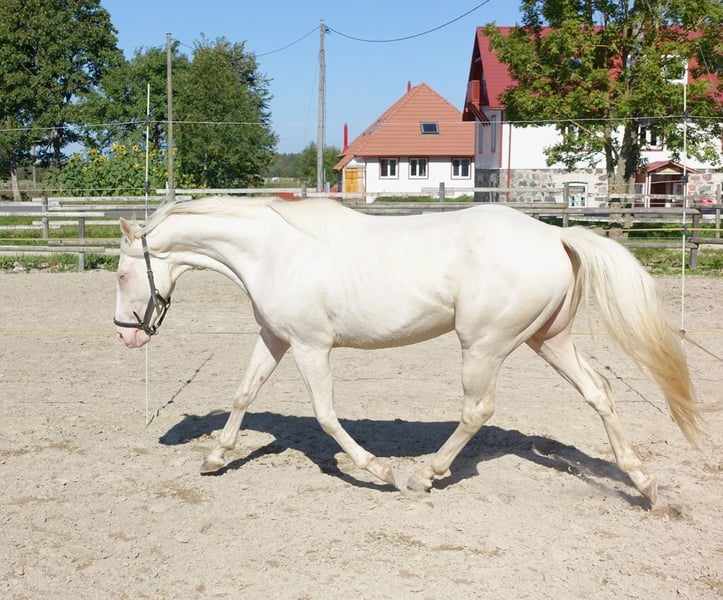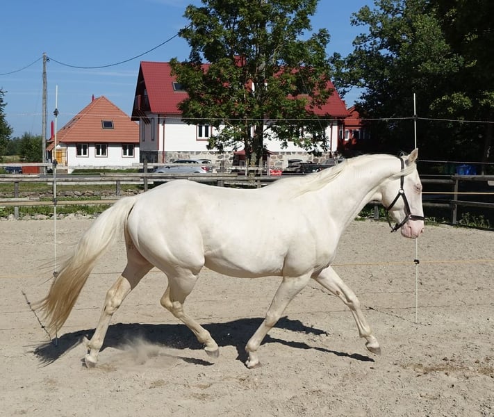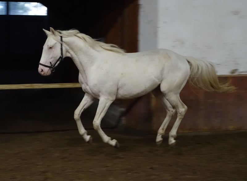 Very beautiful little cremello thoroughbred stallion directly from the breeder. Sire Goldmaker xx by RFF The Alchemist; dam Blonde Remarque by gold Bayou. He has been registered in Estonian Sporthorse Society studbook, which is full member of WBFSH. It is a handsome horse with solid and flawless conformation. He moves well and shows also nice freejump. Sire is 165 cm at withers and dam is 157 cm. The son is in the moment 155 and might grow a lot, but I can not give any guarantees. As he is quite butthigh and still young then I actually expect the final height to be at least his mothers- 157-158cm. Gauri is a completely healthy horse, has never been ill or injured. Has been growing up in the herd, playing and moving a lot with other stallions; is still actually living with them on meadow most of time. He knows well also box/stable life, moving in mange, farriering, loading and trailering. There are videos of general handling and loading. He can go to any direction as a general purpose riding horse. He is not for beginners though to start with as he is a bit sensitive. Steht in einem kleinen Gestüt in Estland, kann problemlos nach Deutschland gebracht werden (500-800 EUR) anneli.kadakas@gmail.com https://www.facebook.com/reinu.talu