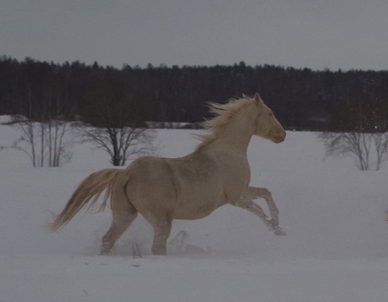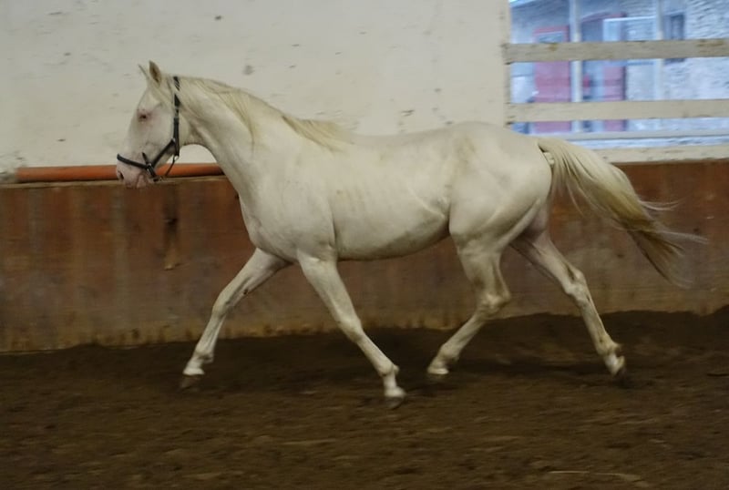 Très beau petit étalon pur-sang cremello, directement issu de l’éleveur. Père : Goldmaker xx par RFF The Alchemist ; mère : Blonde Remarque par Gold Bayou. Il est inscrit au stud-book de la Société Estonienne des Chevaux de Sport, qui est membre à part entière de la WBFSH. C’est un cheval élégant avec une conformation solide et impeccable. Il se déplace bien et montre également de belles qualités en saut libre. Le père mesure 1,65 m au garrot et la mère 1,57 m. Son fils mesure actuellement 1,55 m et pourrait grandir encore beaucoup, mais je ne peux garantir rien. Étant assez massif et encore jeune, je m’attends à ce qu’il atteigne au moins la taille de sa mère, soit 1,57-1,58 m. Gauri est un cheval complètement sain, jamais malade ni blessé. Il a grandi en troupeau, jouant et se déplaçant beaucoup avec d’autres étalons ; il vit encore la plupart du temps en pâture avec eux. Il connaît également bien la vie en box, la manipulation, le maréchage, le chargement et le transport. Des vidéos de manipulation générale et de chargement sont disponibles. Il peut convenir à toutes les disciplines en tant que cheval polyvalent. Cependant, il n’est pas recommandé pour des cavaliers débutants, car il est un peu sensible. Il se trouve dans un petit élevage en Estonie, mais peut être facilement transporté en Allemagne (500-800 EUR). anneli.kadakas@gmail.com https://www.facebook.com/reinu.talu