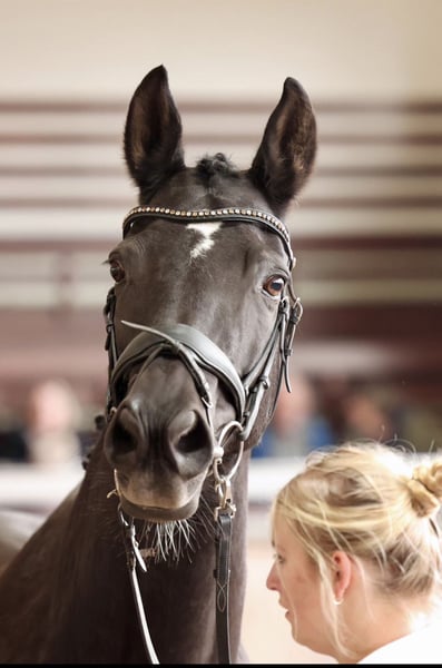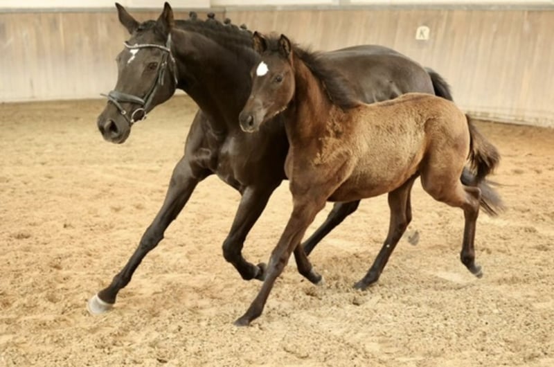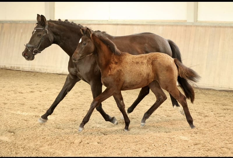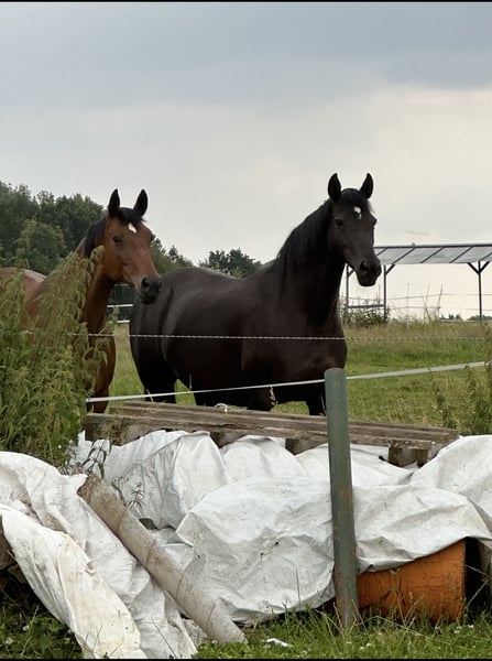 Elegant Trakehner Mare – Versatile broodmare with great potential Born in 2012, this impressive Trakehner mare presents herself in an elegant black coat. Standing at 16.1 hh, she combines size, charm, and character—ideal prerequisites for breeding. As a broodmare, she brings valuable genetic quality, reflected in her excellent conformation and typy appearance. She is extremely friendly and reliable in handling. Her striking presence makes her a real eye-catcher in the stable. Her offspring have been successful in sport, especially in show jumping, including several premium mares. Currently, Raika has a foal at foot (her fifth), which is also for sale but will be weaned soon. The mare is not rideable and is not sold to dealers! We are happy to provide further information and pictures upon request. Contact us for a non-binding viewing—we look forward to your inquiry!