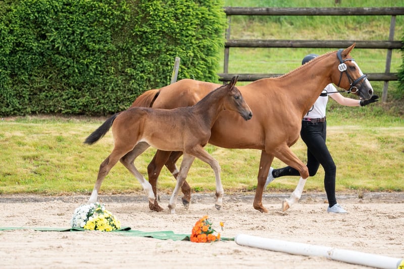 Runenmelodie O embodies athleticism and attributes shaped by blood in nearly perfect form! In her nobility, the prominence of her body parts, and the energetic movements described equally by rhythm and momentum, she is an impressive ambassador of her bloodline genetics. She is one of the very few daughters of the first-class performance-bred Ostinato xx, who has made a good name for himself in the eventing scene despite a limited breeding effort (e.g., as the sire of the eventing stars A la carte and Oskar). On the maternal side, the strong, also highly proven in eventing, son of Zauberklang, Sedar, adds to her pedigree, along with Seratino xx, another bloodline well-established in sport horse breeding. Runenmelodie O has emerged from the traditional successful lineage of Riegelstellung, making her particularly interesting for breeding.