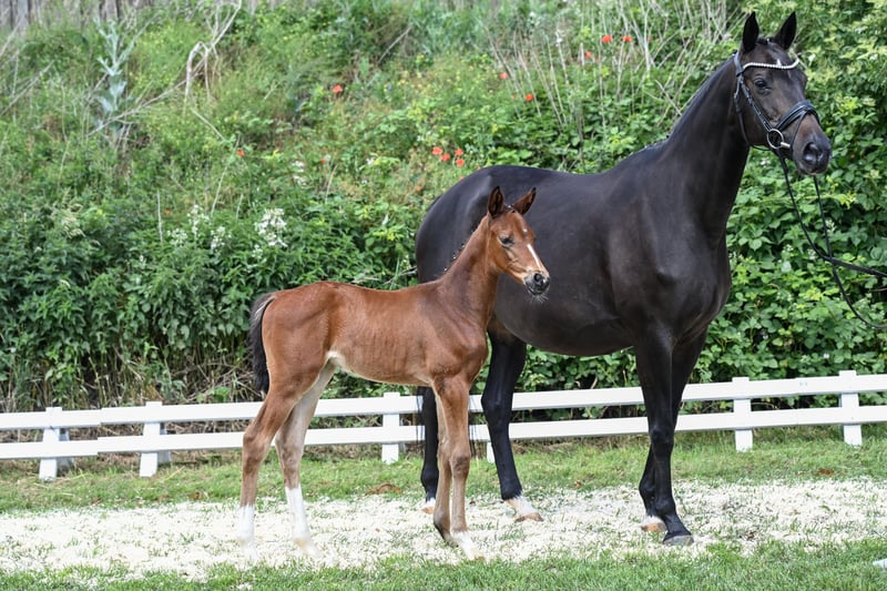Here presents a type-strong and nobly built daughter of the internationally successful Trakehner stallion Glücksruf I in CIC4*. She impresses with consistently rhythmic movements, good swing development, and can be described as a light-footed dancer of a special kind. Genetically, she also leaves little to be desired: Her mother Gardelegen by Insterburg is, among other things, a half-sister of the premium stallion and Bundeschampionat qualifier Goldfieber (by Le Rouge), the licensed stallion Goldmaß (by Schäplitzer), as well as the winning mare Gardena (by High Motion). Furthermore, she is closely related to the licensed stallion Greenwich Park (by Saint Cyr), who has been successful up to Grand Prix. The foal is growing up appropriately in the herd at the Gestüt Schäplitz and can be viewed at any time. A video is available upon request.
