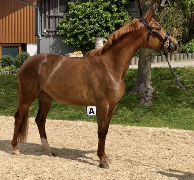Hailey is a stunning, noble chestnut mare. In May/June 2024, she was lunged and introduced to the saddle and rider. Afterwards, she spent another year in the stable and on the pasture, as she was born late in the season. From July 2025, she was backed and started under saddle with the Bavarian Breeding Association in Munich-Riem. Impressions from the foreign rider test during her mare performance test (after 7 weeks of training!). See video! Performance test evaluations include: Character 10.0; Temperament 9.0; Willingness to perform 9.5; Conformation 9.0 Hailey is rideable (and comfortable to sit), friendly, and well-behaved. Health condition = top fit. X-ray images from August 26, 2025: no findings! Hailey’s pedigree: Sire: P.H. Karim Dorè (see attached picture – chestnut stallion) On her sire’s side, she descends from the Grand Prix dressage horses E.H. Imperio and E.H. Insterburg – the highest-rated Trakehner “Star” sires of 2025, ranked 1st and 2nd. Dam: St.Pr. and Pr.St. Hetidze v.H. (see attached picture – Rapp mare) On her dam’s side, the Trakehner stallions E.H. Monteverdi and Ibikus guarantee excellent riding horse qualities. Hailey’s very good general impression (see video at the longe line) continues to be developed – now under the rider. Hailey can be tested under saddle at any time. For inquiries and to arrange a viewing, please contact her rider and trainer, Kathrin Reisinger, at: +49 173 2732008.
