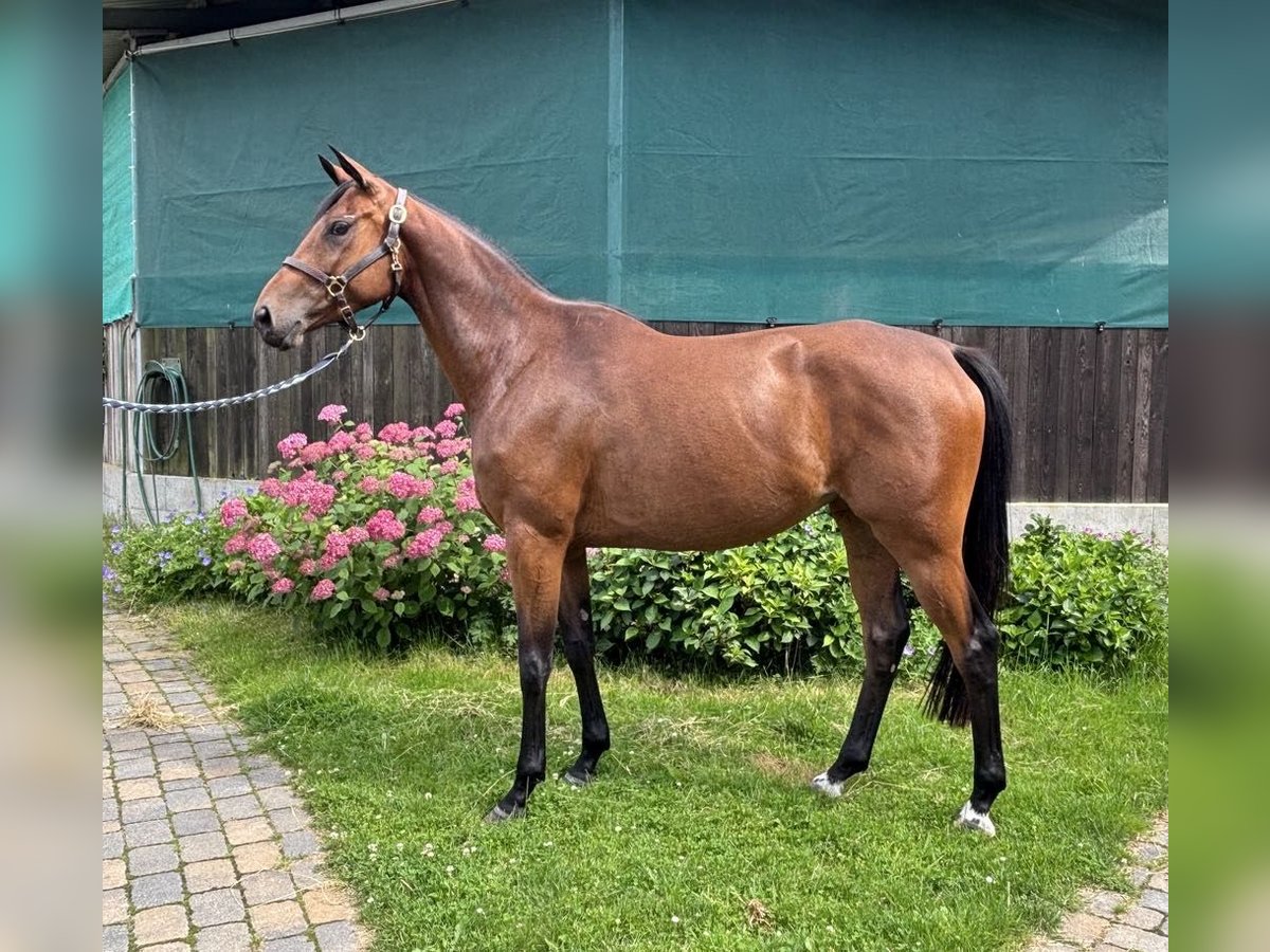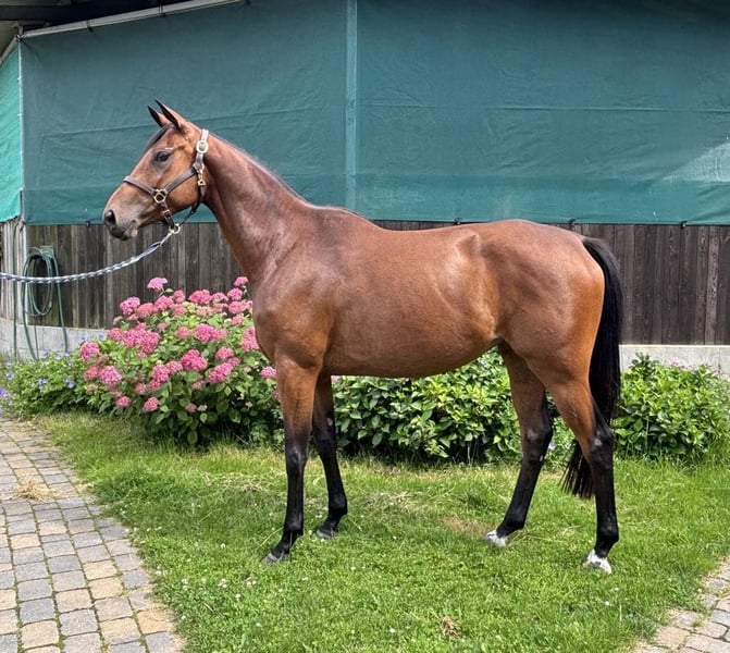Highly interesting 4-year-old half-bred mare with a current height of 1.69 m by Duke of Hearts xx out of the Pr. mare Buena Vista by Guardian and the Pr. + St.Pr. mare Beate by Kostolany out of the elite mare Brightness xx. She was a highly rated foal and is now for sale as a breeding prospect and future eventing horse. Her full brother Buon Giorno, a stallion candidate for the 2024 stallion market, has been sold as a show jumping horse to China. From the family of Brightness xx also comes the licensed stallion Bertone, placed in eventing M (Preis der Besten) and show jumping S. The granddam Pr. + St.Pr. Beate by Kostolany was the highest-rated half-bred mare of her year. From this family come several eventing horses and very good broodmares. If you are interested, please feel free to get in touch.