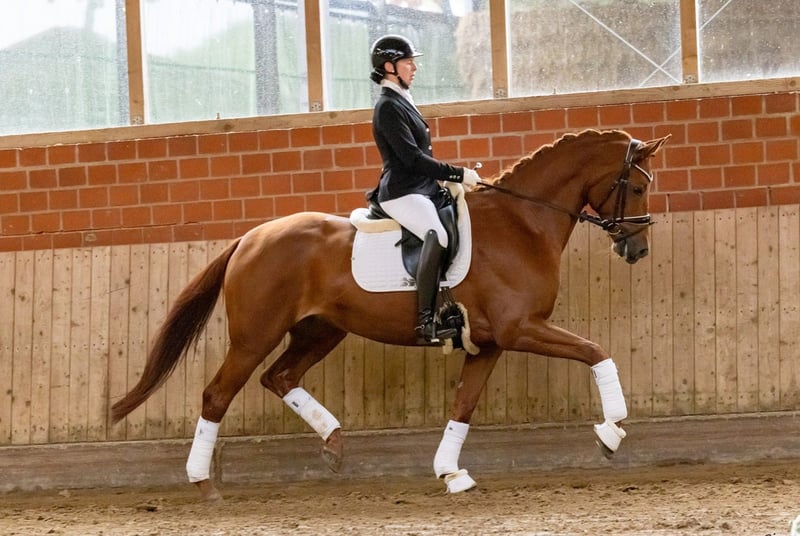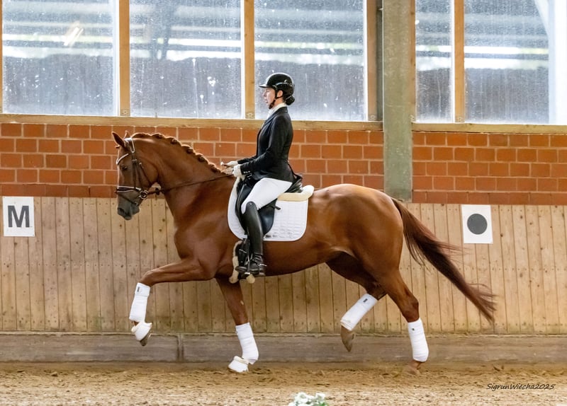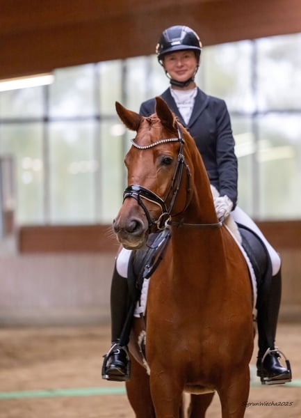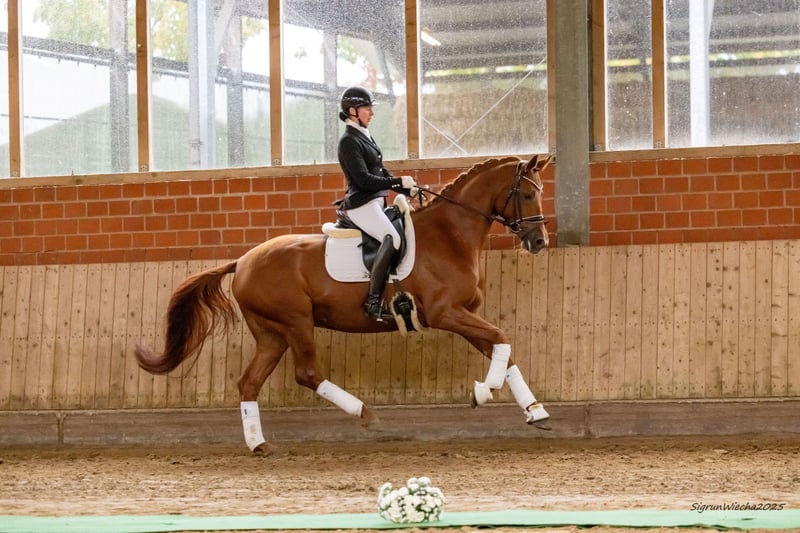 Esta princesa deportiva, en un estado de desarrollo excelente, se presenta de manera espléndida con una actitud ejemplar. Su entusiasmo por el trabajo y su voluntad de rendir son cualidades innatas; desde el inicio de su carrera, impresionó con una prueba de rendimiento de primera clase, obteniendo una calificación de 9.0 en manejabilidad. Ha obtenido colocaciones en pruebas de caballos de doma en las categorías de A y L. Como yegua de alto nivel premiada, también está destinada a la cría, proveniente de un linaje exclusivo que encarna una gran tradición en la cría caballar de alta calidad. Familia del campeón de doma S licenciado Lion’s Club y del semental de alto perfil Latimer, quien ha ganado todo lo que hay que ganar desde el Bundeschampionat hasta las clases de doma S. Para más información, consulte: https://bid.trakehner.auction/auctions