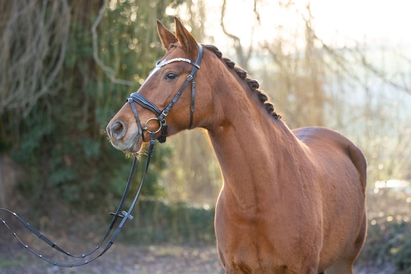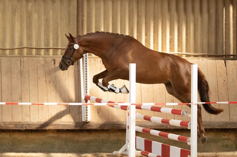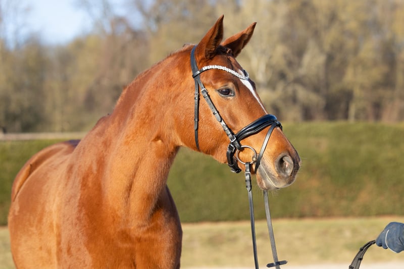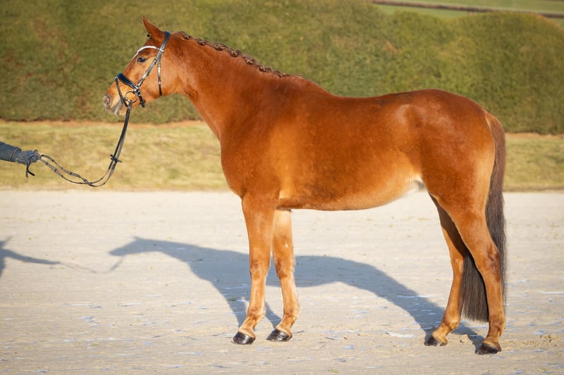 The chestnut mare is out of the Herzruf daughter Nadja and possesses the highly sought-after double aptitude. She demonstrates impressive free jumping and remains focused when working over poles and cavaletti. She is also fearless in the field. Her movements are easy to sit, she moves with lightness in the frame, and responds delicately to subtle aids with a soft mouth. She successfully completed her mare performance test with an overall score of 7.45.