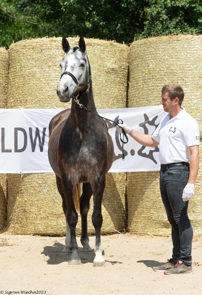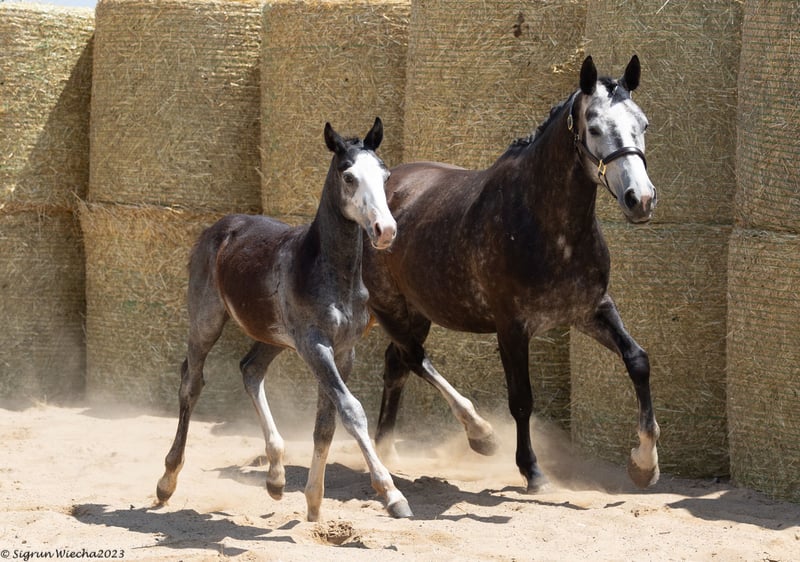 This horse is part of our Select Sale 2024 collection and you can register for this promotion now. The bid up starts on 01.01.2025 from 19:00 (CET). Copy the auction link and paste it into your browser: https://auction.sweetwater-stud.com/auctions Our "Grand Dame" Bella Chocolotta by Suchard - Machandel gave us fillies almost without exception. We are therefore able to provide breeders and riders with female offspring from this very fertile, high-performance mare family. BELLISSIMA has three good basic gaits. Harmonious in body, standing over a lot of ground, this important mare is a jewel for breeding. Bellissima is lunged and easy to handle, but has not received any further training. Due to her age, there is no reason why she should not be trained and used as a sport or leisure horse. Registered with a total score of 53 points, she is also a premium candidate and can be awarded the title of "premium mare" if she performs well or passes a mare performance test. The performance-tested dam (SLP final score 7.92) Bella Chocolotta by Suchard is a half-sister to four stallions licensed in various breeding associations. These include the half-blood Pampero by Panchero II AA, impressive winner of the 70-day test in Marbach and the ZSAA-licensed B.B. King by Best Before Midnight, who completed a very good 30-day test and was successful in VS tests at shows. Her half-sister Belle Petitesse is registered in the ZSAA performance studbook. The maternal grandsire Suchard, himself successful in show jumping up to advanced (S) level, is the sire of the licensed stallions Ballisto Z, Budweisser Classic, Becket and the full brothers Lossow and Lessen (GB). The list of his successful offspring is long. He produced a number of athletes for eventing and jumping in the Trakehner, Oldenburg and Rhineland breeding programs. Finch Hatton TSF is one of his best-known offspring, alongside the successful stallions Ballisto Z and Budweiser Classic. Suchard is also the sire of E.St. Blanchette, dam of Blancor. Through granddam Bella Marjell, also listed in the ZSAA performance studbook (section D 10/10), Belletristik lists the blood of Machandel, who was victorious in high performance show jumping and was later stationed in Poland. Through the sires Bartholdy, Seeadler by Habicht and the hard thoroughbred Nemrod xx in the falling mare line, one finds concentrated performance on the basis of a Polish mare line. The third dam, Bella Babette by Bartholdy, is a full sister of the eventing horse Ben Bartholdy, who was successful up to medium (M) level. Bellissima's half-sister BELLEZIGANE (*2019) was an auction horse at the 59th Trakehner Stallion Market in 2021 and was entered in the Trakehner Stud Book in Hesse in 2023 with a premium score of 53.5. Bellissima produced a well-rated colt in 2023 and was not covered in 2024. She can therefore be covered early in 2025 if she continues to be used as a broodmare. Sire STURMKLANG was unfortunately not further promoted as a young stallion. After successfully passing his stallion performance test and licensing, he achieved his first successes in tests for young riding and jumping horses up to class A** under Fabian Lipsky. He comes from the widely ramified and very valuable family 0170A der Schwindlerin (Elxnat, Hohenkirchen). His dam is the St.Pr.u.Pr.St. STÜRMISCHE by Matador. With her not too widespread pedigree via Matador, Grandezzo, Solling and Ernest, she has a lot of Trakehner jumping blood, which this mare passed on to her offspring. With Altan I, Absalon and Abendstern, her pedigree includes sires of the most typey lines in Trakehner breeding. In addition to this type, which Sturmklang certainly passes on, all his offspring are equipped with three very good basic gaits, have correct foundations and are also talented jumpers. Sturmklang, who had been little used until his arrival at our stud, is now making his debut in the Trakehner breed with daughters who have been registered as premium candidates many times and who in turn have already produced highly bonit foals. ZB rating: 7.5/7.5/7.5/8/7.5/7.5/7.5/7.5,/53 - premium candidate ZL 1/1 Further information on our website: https://www.sweetwater-stud.com