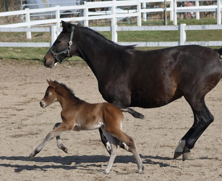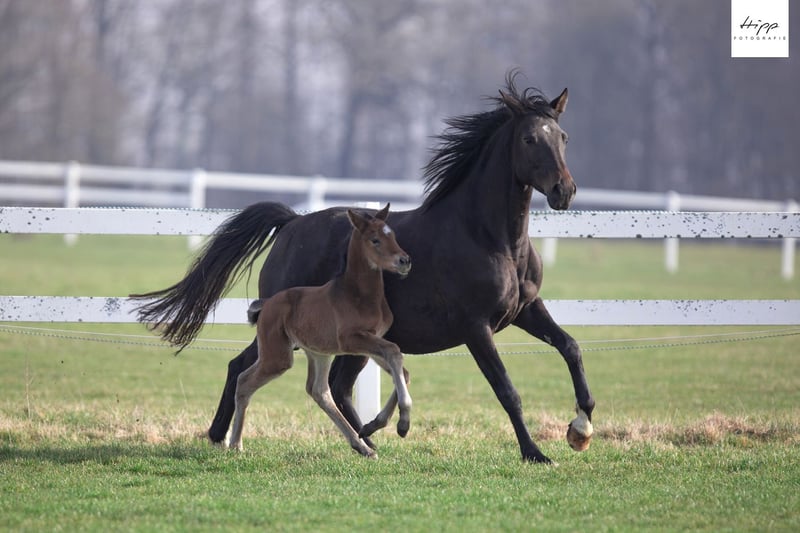 Une jeune demoiselle très confiante avec une excellente génétique est proposée à la vente. Origine rare et de haute qualité avec des ancêtres sportivement confirmés. Le père, Karlsson I, a été placé en dressage et saut d'obstacles en L, et a obtenu de très bons résultats en compétition jusqu'à ***. La mère, Bellevue, issue de la lignée Gabun, très performante en S, a réussi la inspection de performance (SLP) comme deuxième meilleure à l’élevage. Ce petit poulain peut être visité chez nous, et pourrait également rester après le sevrage pour poursuivre sa croissance. Photos : Julia Hipp/Knaack-Lindemann