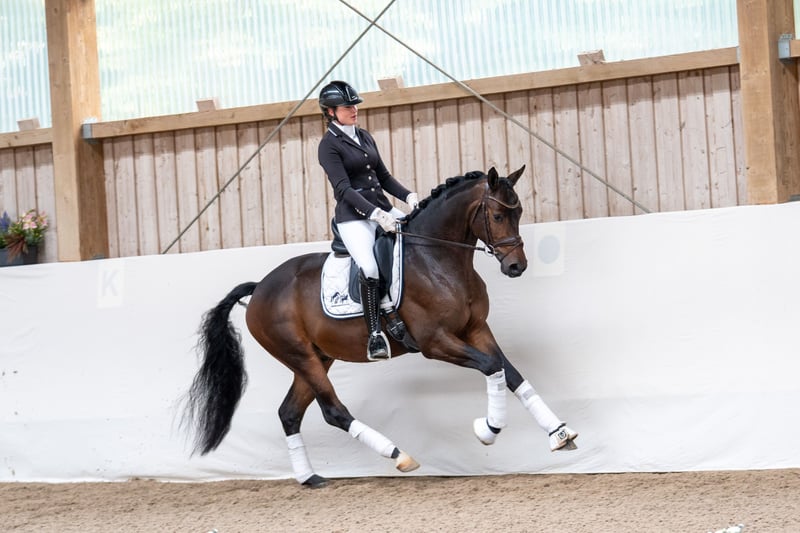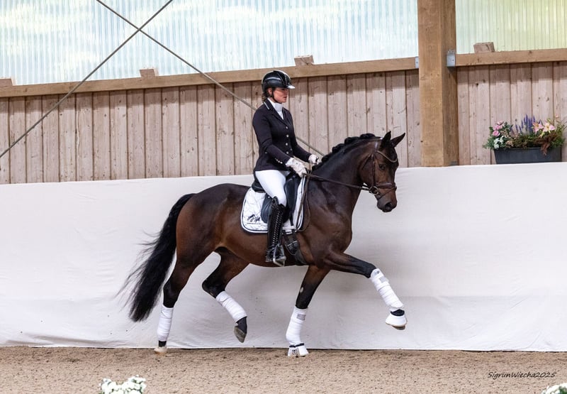 Kiano is a dressage horse with an impressive movement style, modern and expressive, and possesses an impeccable temperament. His generous, long-reaching walk, striking trot, and balanced yet energetic canter set high standards. He was licensed at Neumünster in 2024, from the first crop of his successful S-dressage sire Rheinglanz, and is closely related to the Danish champion mare Kampala (NMS 2009/85), the S-dressage horse Kronprinz, and Staffelde’s S-dressage diva Krone (Natalie Soujon). Further information can be found at: https://bid.trakehner.auction/auctions