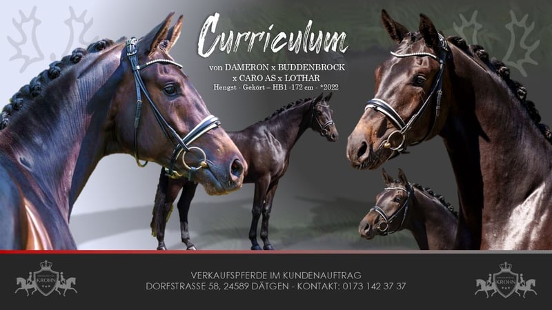 TYPBRILLIANZ TRIFFT PERFORMANCE - GEKÖRTER TRAKEHNER DECKHENGST (HB1) DER LEHRBUCHMÄSSIGE DIE IDEALE DER TRAKEHNER REINZUCHT VERKÖRPERT Zum Verkauf steht in Vertretung des Besitzers, dieser 172cm großer, dunkelbraune, 4-jährige, gekörte & leistungsgeprüfte (50-Tage / HB1) traklehner Bewegungskünstler. Er stammt ab von DAMERON aus ein BUDDENBROCK x Caro As Mutter und sein Pedigree lässt großes für die trakehner Zucht und den trakehner Sport erhoffen. Er steht im Deckeinsatz, kann aber auch vom Käufer gelegt werden. Nomen est Omen "CURRICULUM" (=Lehrbuch) hier ist der Name Programm - Ein Trakehner der lehrbuchmäßig jene Attribute verkörpert, die die Trakehner Reizucht zur edelsten der Welt gemacht haben. Er ist nicht nur Talentiert, sondern eine wahre Attraktion für Kenner, die Adel, Härte und Intelligenz in einem Dressurnachwuchspferd suchen. LEHRBUCHGENETIK: "CURRICULUM´S" Pedigree ist ein Statement für züchterische Weitsicht. Über seinen Vater DAMERON und den Muttervater & Elitehengst BUDDENBROCK ist in Linienzucht höchste Rittigkeit und ein Interieur aus Gold genetisch fixiert. Mit Caro As und Lothar im fallenden Stamm ist er über Generationen auf Leistungsfähigkeit, stabiles Fundament und Trockenheit abgesichert. ADEL & TYP: Sein Gesicht mit großem, intelligenten Auge und seine maskulinier Ausstrahlung verkörpern Lehrbuchmäßig den Trakehner Adel und ist die optische Attraktion auf jedem Parkett. INTELLIGENZ & CHARAKTER: "CURRICULUM" ist ein Musterschüler. Mit schneller Auffassungsgabe und unerschütterlicher Loyalität ist er der Ideale Partner für den gehobenen Dressursport. Sein sympatischer Charakter besticht durch absolut Vorsicht und Zärtlichkeit. Ihn kann man Bedenkenlos von einem Kleinkind in der Box Putzen lassen. Er behält übersicht und liebevolle Anhänglichkeit. ATHLETIK: Er ist ein Lehrbuch-Schüler, der mit schneller Auffassungsgabe, abgeklärtheit, Leistungsbereitschaft und toller Mechanik zukünftig im Viereck überzeugen wird. Mit stabilem Fundament, guter Winkelung und ansprechendem Seitenbild kann er die reiterlichen Hilfen bereits gut annehmen und umsetzen. Er ist seid dem Einreiten im professionellem Beritt und befindet sich auf Dressurpferde A Niveau und ist bereit für seine ersten Turnierauftritte. Bei der HLP zeigte er sich sowohl beim Stationsreiter im Vierek und im Spring Parcour rittig und stellte sich souverän auf den Fremdreiter ein. "CURRICULUM" ist ein hochkarätiges Sportpferd & wertvoller Verendler für die Trakehner Zucht. Die Antwort für Reiter und Züchter, die keine Kompromisse eingehen wollen. Er ist die lehrbuchmäßige Verkörperung der Trakehner Zucht. Edel, hart und rittig. Ein Hengst der hält, was sein Name verspricht. Es liegt ein aktueller, guter klinischer und röntgenologischer (Standard + Hals + Rücken) Tüv vor. "CURRICULUM" könnte nach dem Kauf auch gerne bei uns in professionellem Beritt zur weiteren Förderung und Turniervorstellung verbleiben.