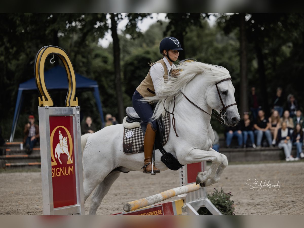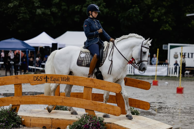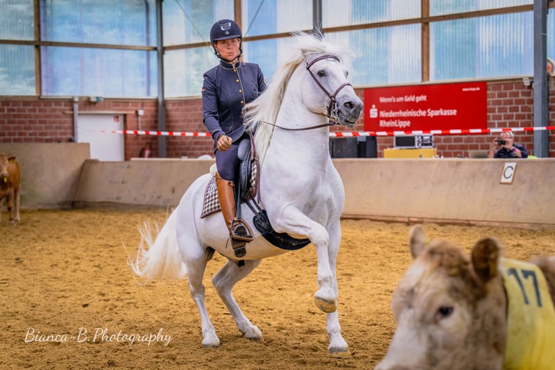 Ufano des Iscles is an impressive very powerful Camargue stallion. It was still certified at the Mas de la Cure in the Camargue and imported by us in 2014. His certification was confirmed in the Rheinische Pferdestammbuch for Germany and it is said to be of great importance for German breeding. With us, the first foal is very promising and will remain and be trained as a basket candidate. Ufano is trained in dressage up to S, jumps clean 2-s and 3 - he changes and is currently working on the 1-man changes. Piaffe and Passage he shows committed and clean. He works on the cattle, goes flawlessly also challenging trail courses and is intrepid in the terrain. At the fairs and shows, he shows himself to be nerve-racking and pays great attention to his herd. Due to its baroque mass, it is an impressive appearance. Nevertheless, the horse is fine at the aids, very committed and also agile. In the Camargue he registered foals in the year 2013. We have chosen our "Brummer" especially for the already very large bred broodmares in order to get a successful mixture of beauty and original robustness of the Camargue horse. Ufano is always a somewhat anxious-looking horse who works diligently, but is also determined if something is not demanded correctly. Very impeccable in character.