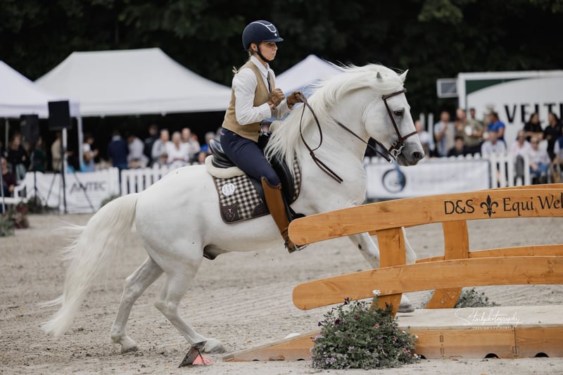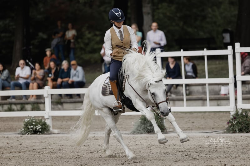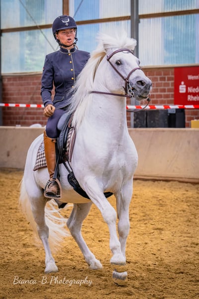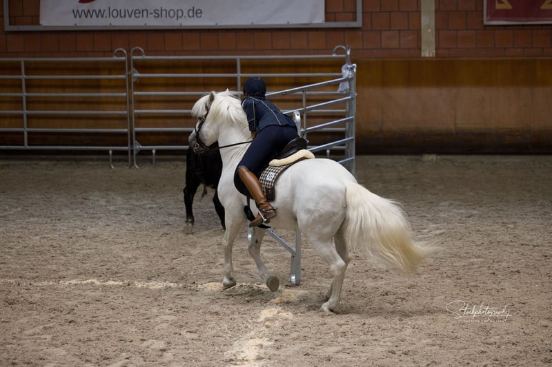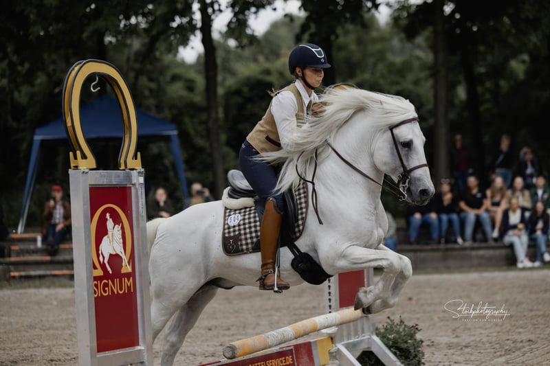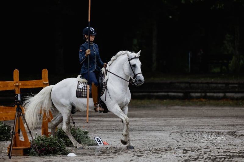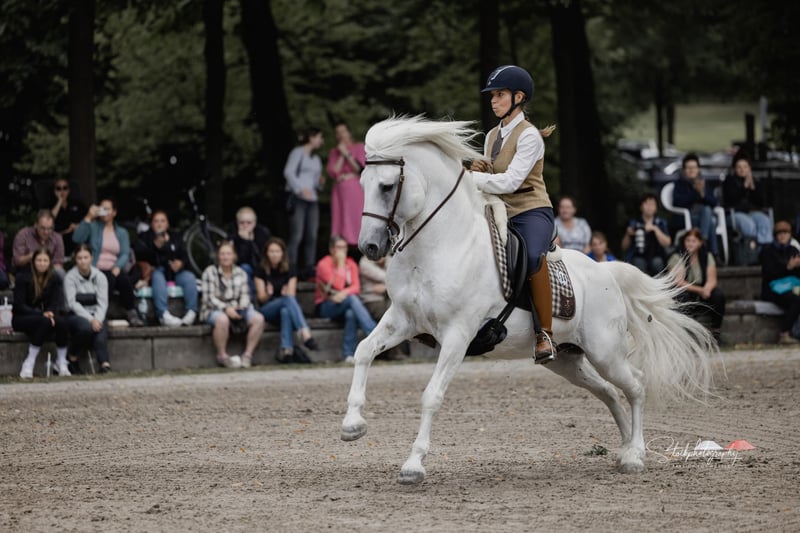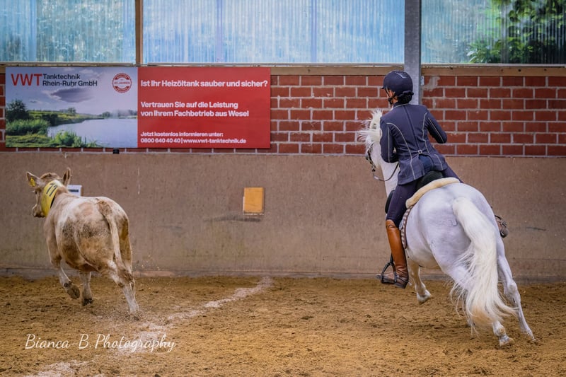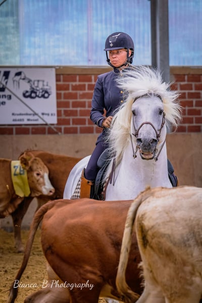 Ufano des Iscles è uno stallone della Camargue impressionante e molto forte. È stato autorizzato dal Mas de la Cure in Camargue e importato da noi nel 2014. La sua licenza è stata confermata dal Rhineland Studbook per la Germania e si dice che sia di grande importanza per l'allevamento tedesco. Il suo primo puledro è molto promettente e rimarrà per essere addestrato come candidato alla licenza. Ufano è addestrato al dressage fino al livello avanzato (S), salta in modo pulito doppi e tripli cambi e sta attualmente lavorando sui singoli cambi. Mostra impegno e pulizia nel piaffe e nei passaggi. Lavora sul bestiame, è impeccabile anche su percorsi impegnativi ed è impavido in campo. Mostra nervi saldi alle fiere e agli spettacoli e presta molta attenzione alla sua mandria. La sua massa barocca lo rende uno spettacolo impressionante. Tuttavia, il cavallo è bravo negli aiuti, si impegna molto ed è anche manovrabile. Ha registrato dei puledri in Camargue nel 2013. Abbiamo selezionato il nostro "Brummer" principalmente per le fattrici già molto grandi, al fine di ottenere un riuscito mix di bellezza e robustezza originale del cavallo della Camargue. Ufano è sempre un cavallo dall'aspetto un po' ansioso che lavora con diligenza, ma è anche determinato se non gli viene chiesto di fare qualcosa correttamente. Il suo carattere è davvero impeccabile.